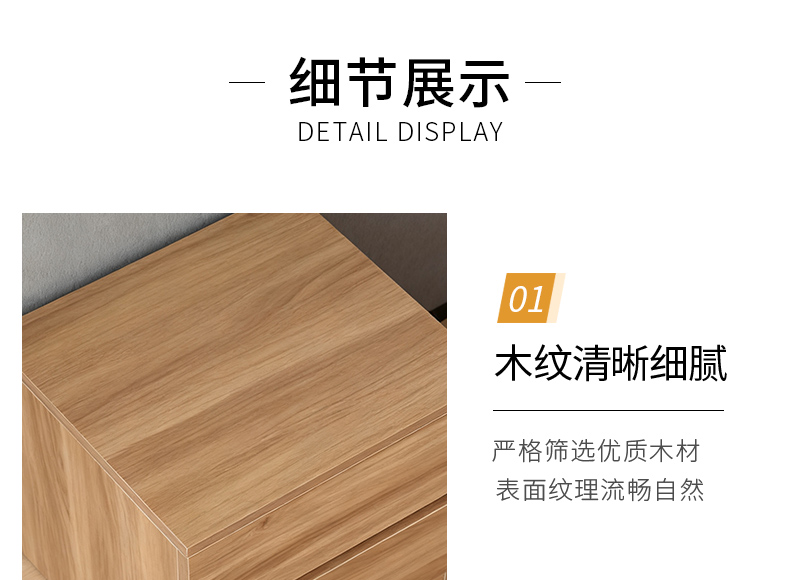 设计简约现代,放在卧室很搭。抽屉推拉顺滑,收纳空间足够。木质材料质感不错,没有异味。安装简单,用了几个月还是很稳固。
