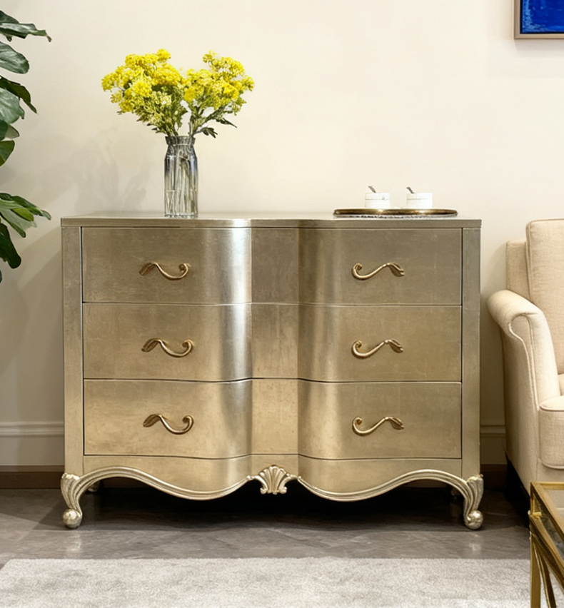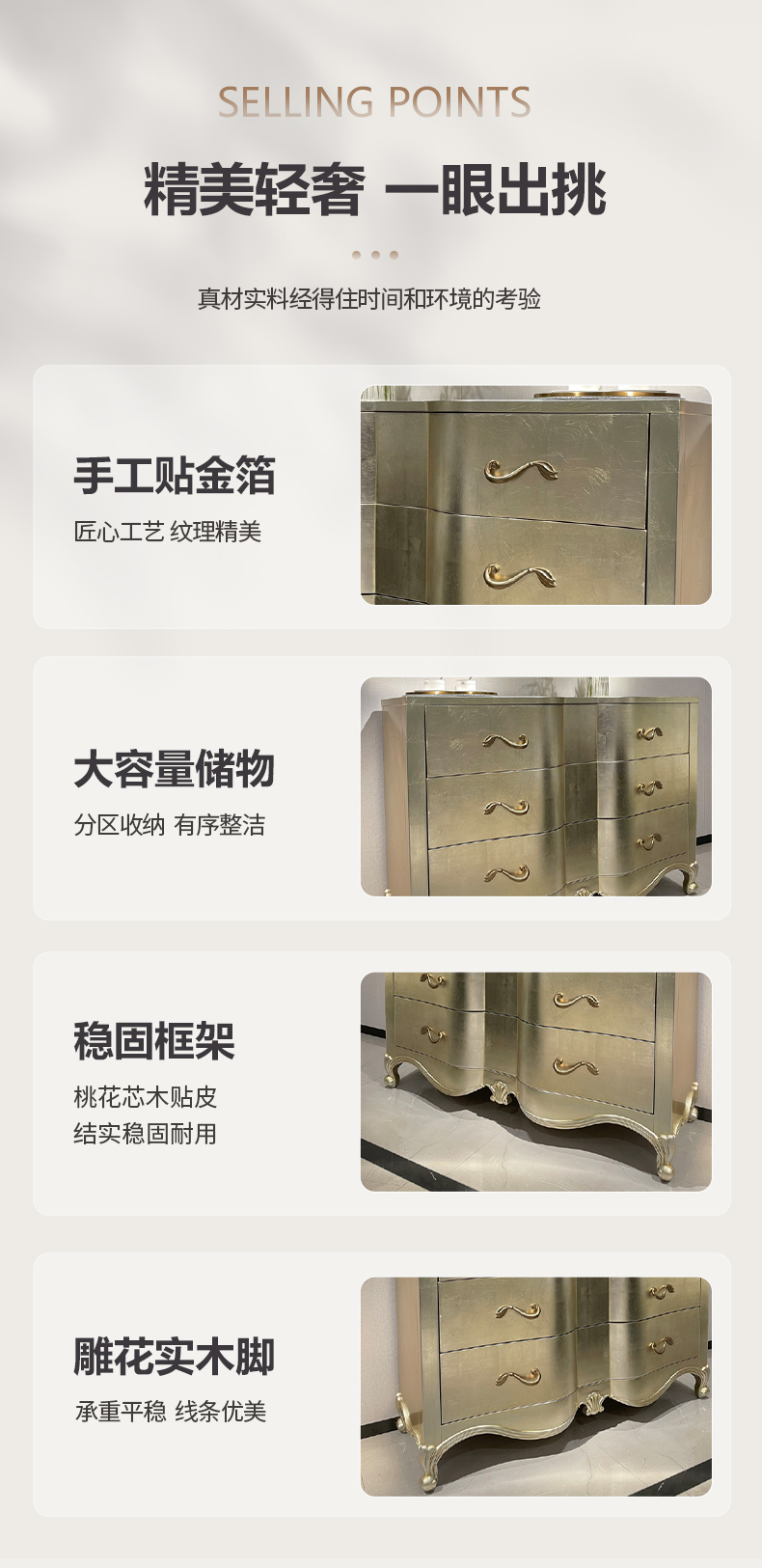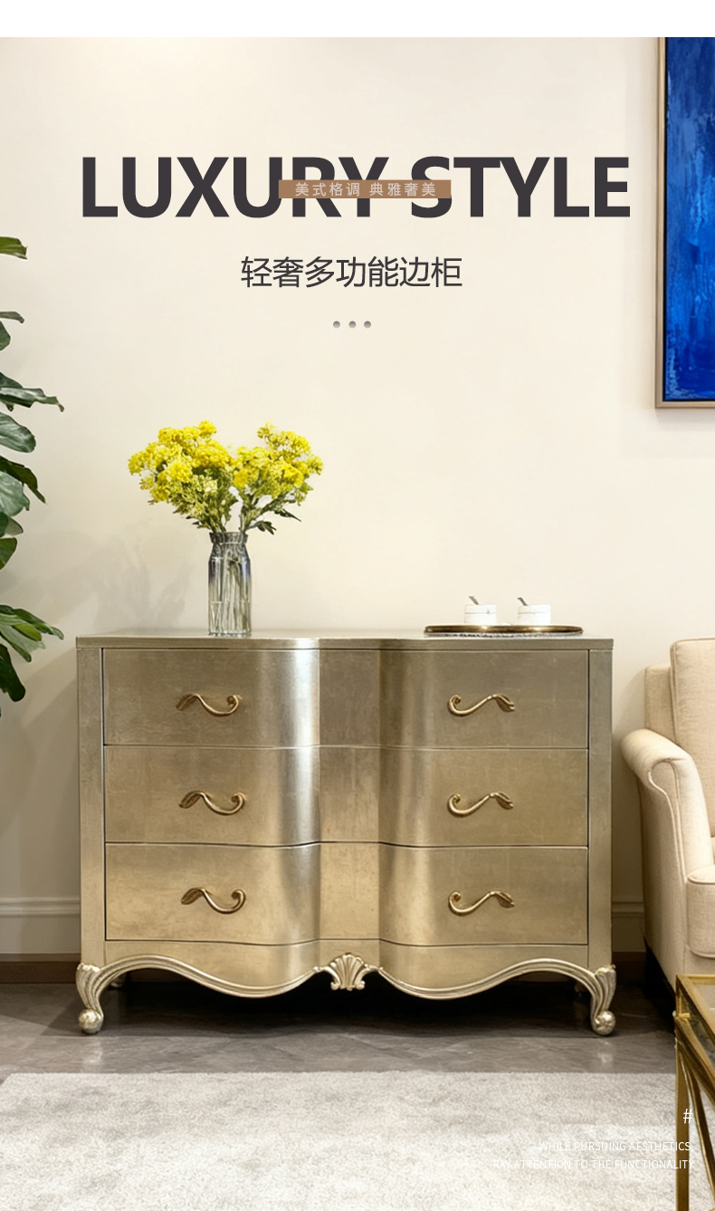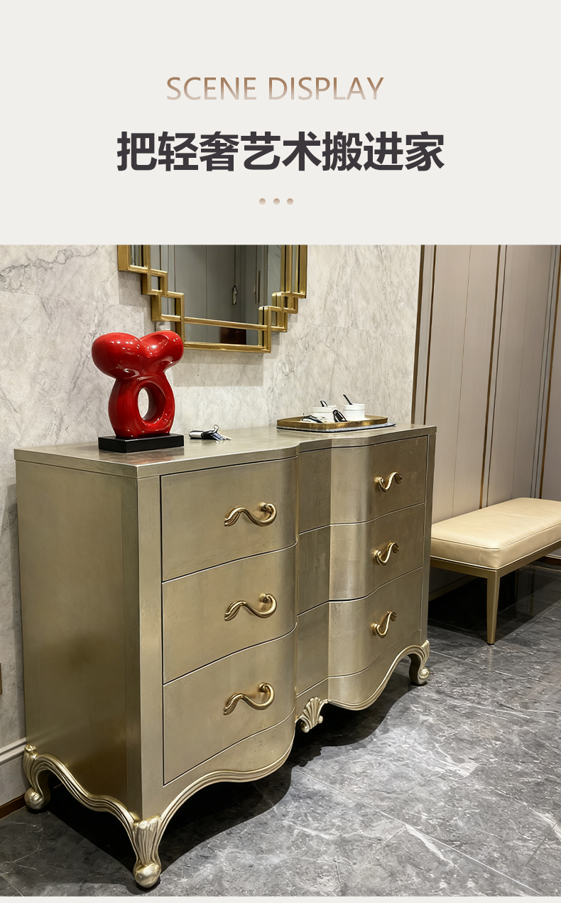 商品名称:【精品】千匠一品 美式轻奢风格 桃花芯木贴皮+自闭滑轨+手工贴金箔工艺 时尚大气亲密关系多功能柜M-DE613-J