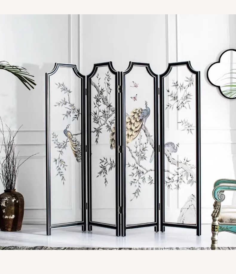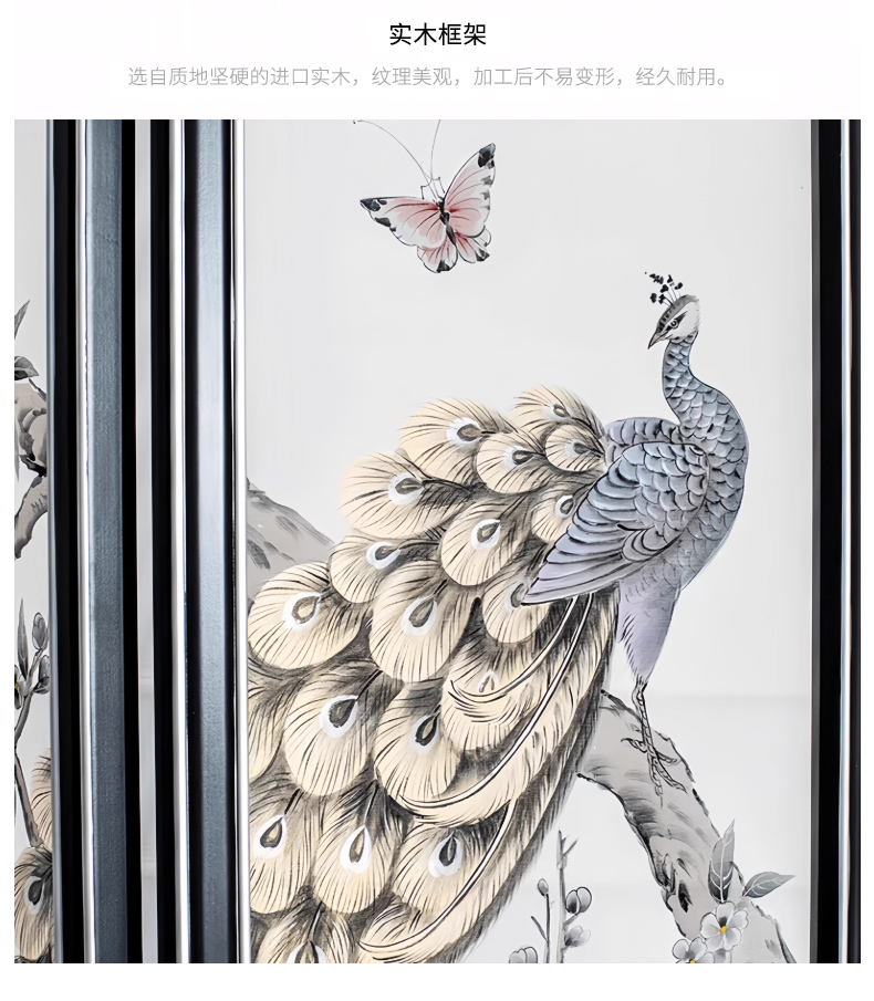 【精品】千匠一品 美式中古风格 实木框架手绘 时尚大气孔雀半透屏风BT-PF711-L