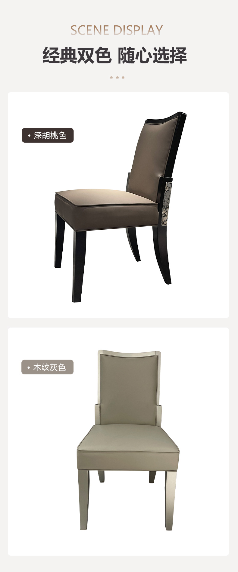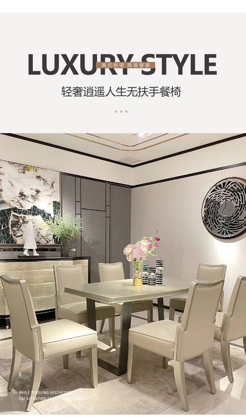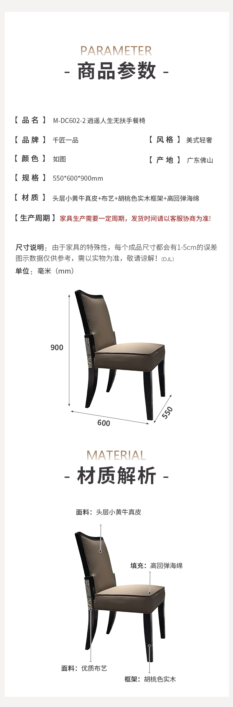 商品名称:【精品】千匠一品 美式轻奢风格 头层小黄牛真皮+布艺+胡桃色实木框架+高回弹海绵 时尚大气逍遥人生无扶手餐椅M-DC602-2-J