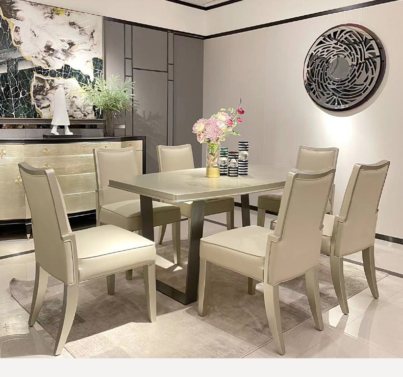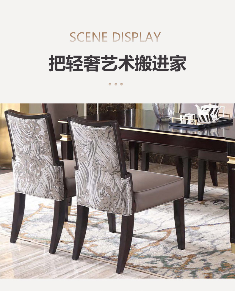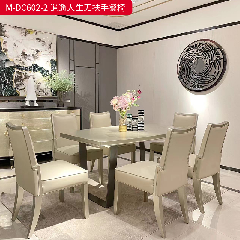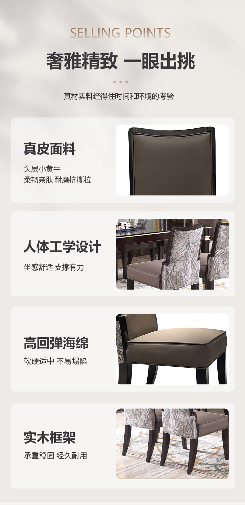 商品名称:【精品】千匠一品 美式轻奢风格 头层小黄牛真皮+布艺+胡桃色实木框架+高回弹海绵 时尚大气逍遥人生无扶手餐椅M-DC602-2-J