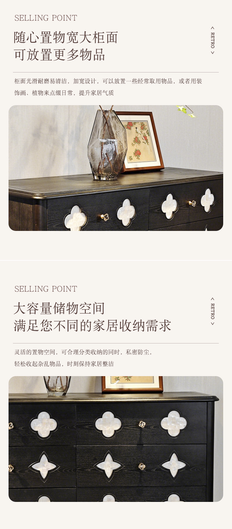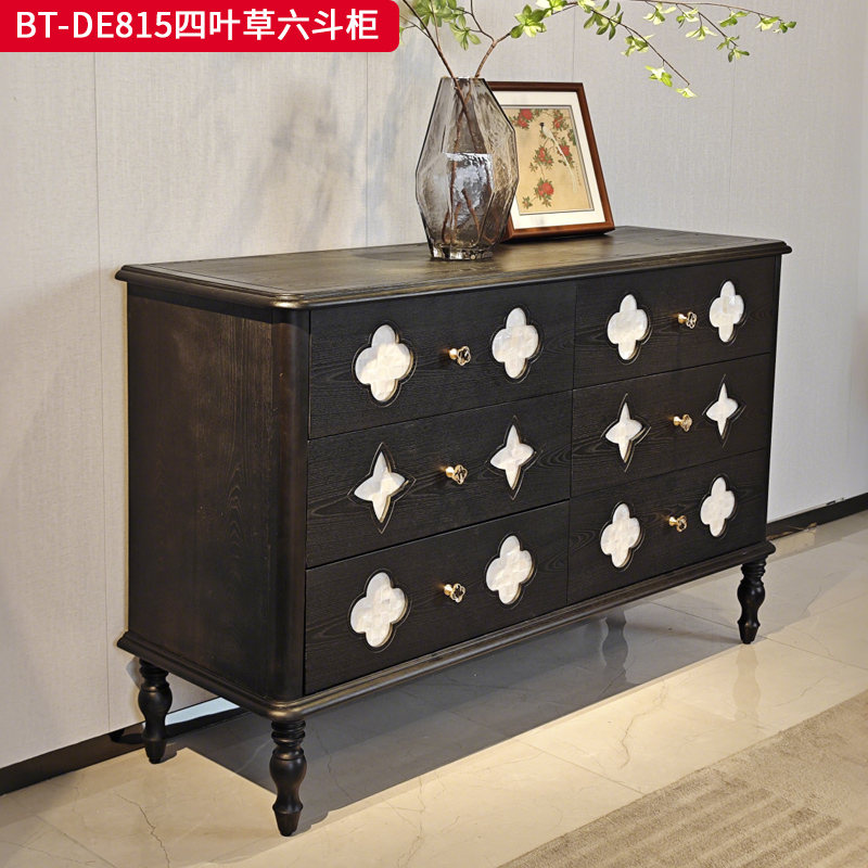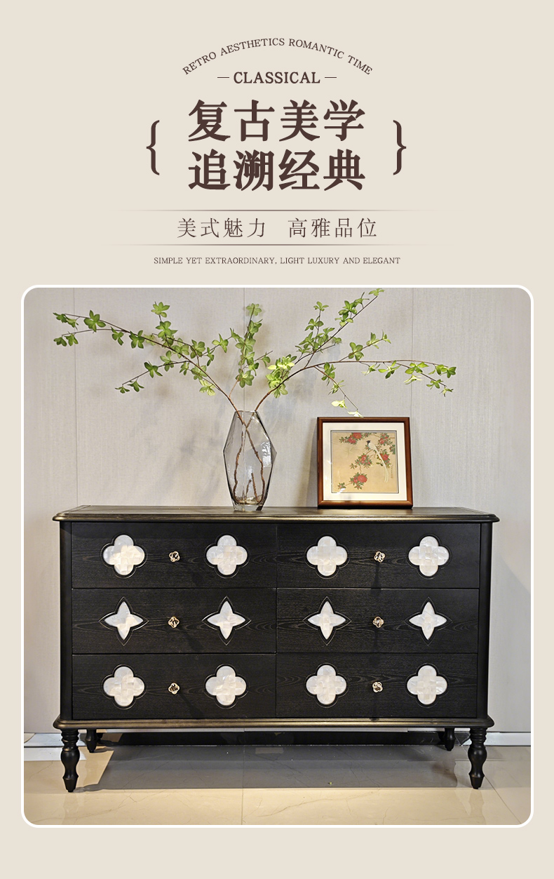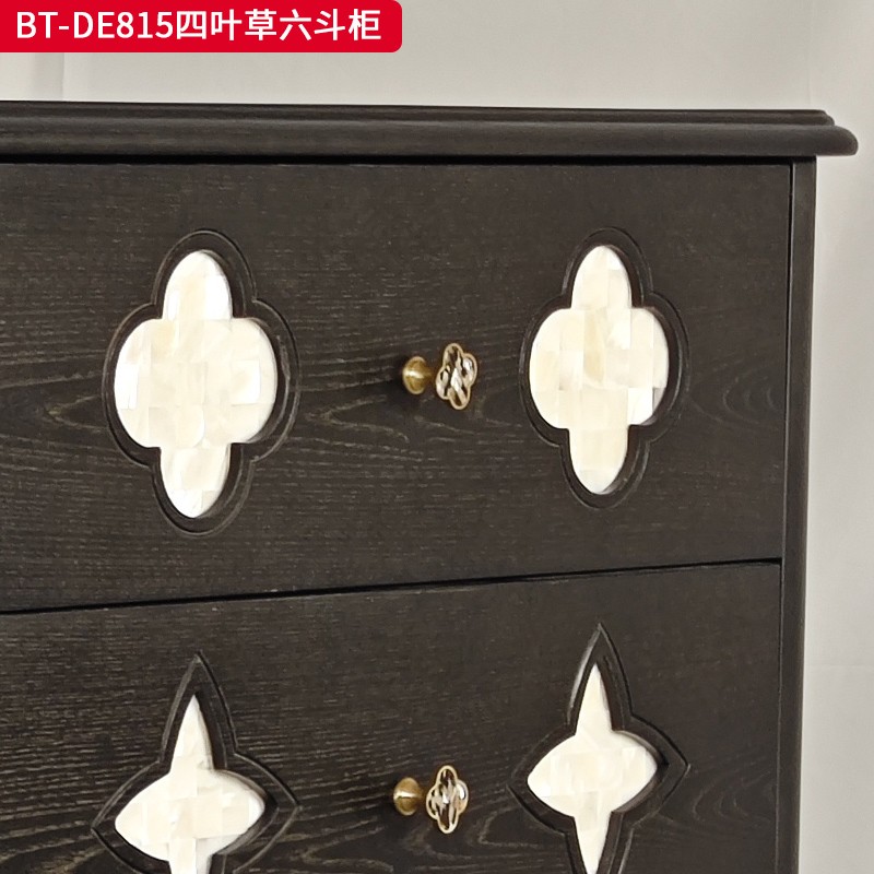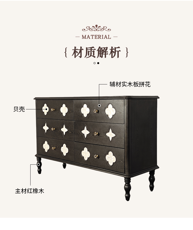 商品名称:【精品】千匠一品 美式中古风格 主材红橡木+辅材实木板拼花+贝壳 时尚大气六斗柜BT-DE815-L