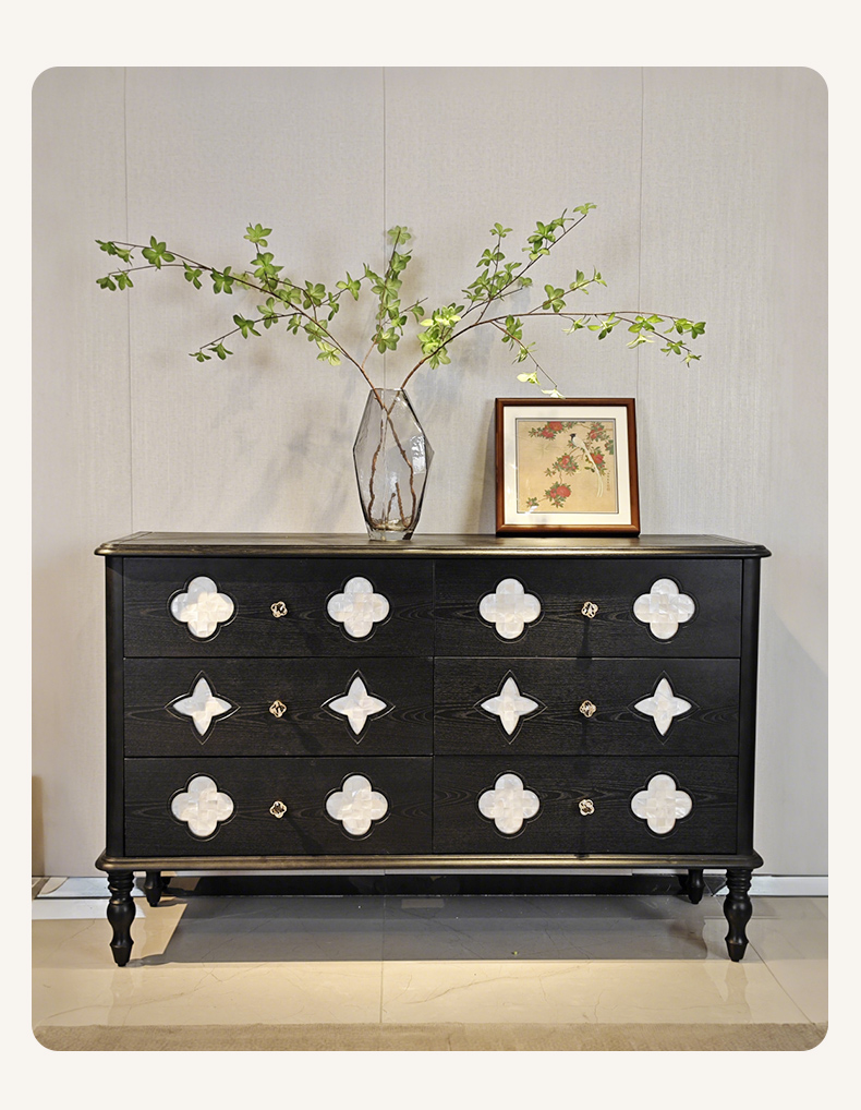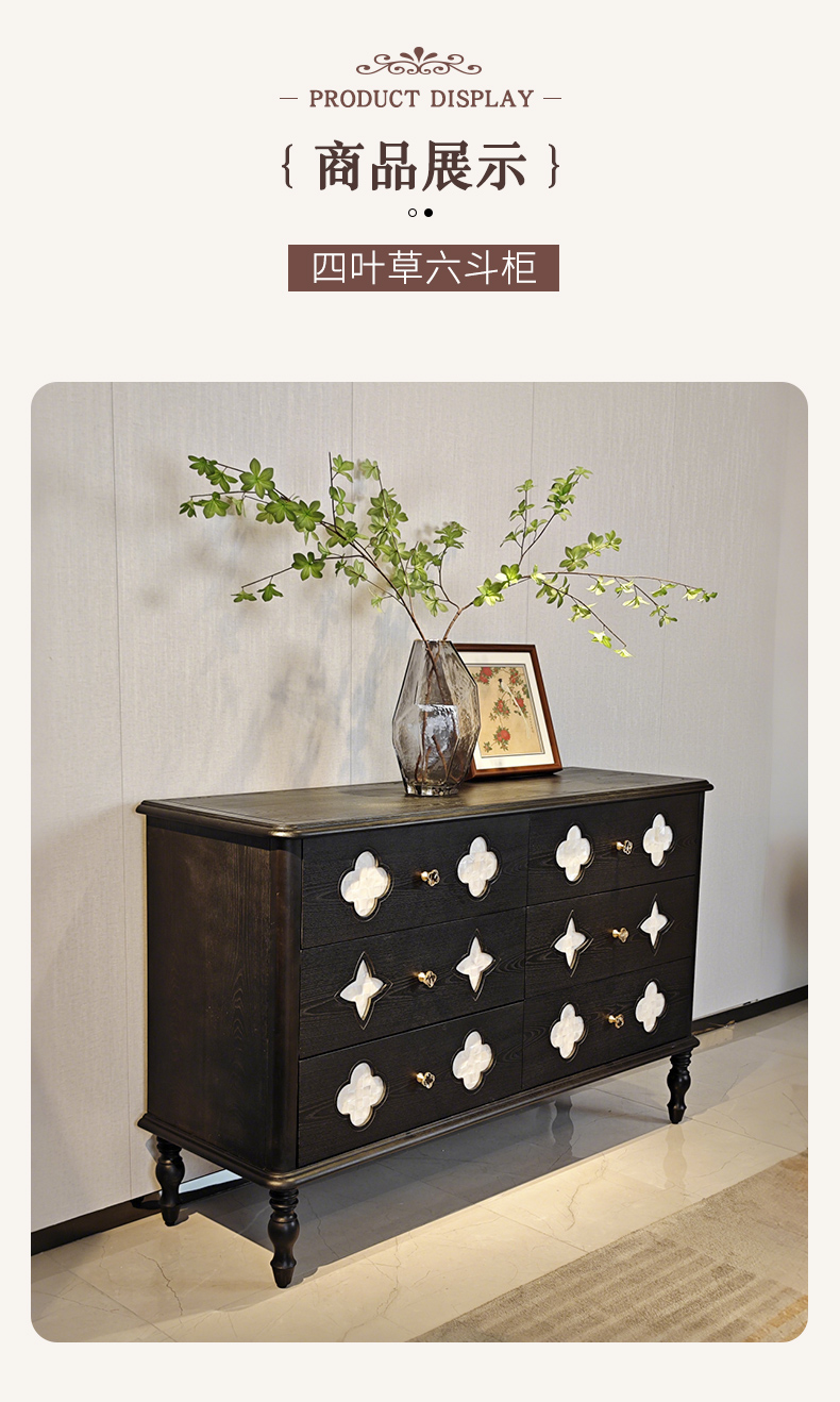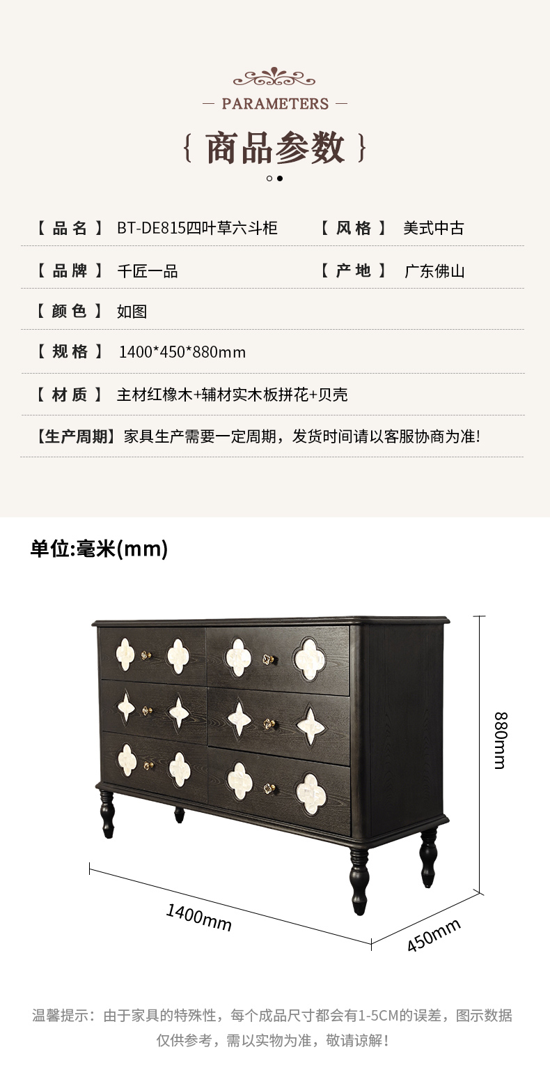 商品名称:【精品】千匠一品 美式中古风格 主材红橡木+辅材实木板拼花+贝壳 时尚大气六斗柜BT-DE815-L
