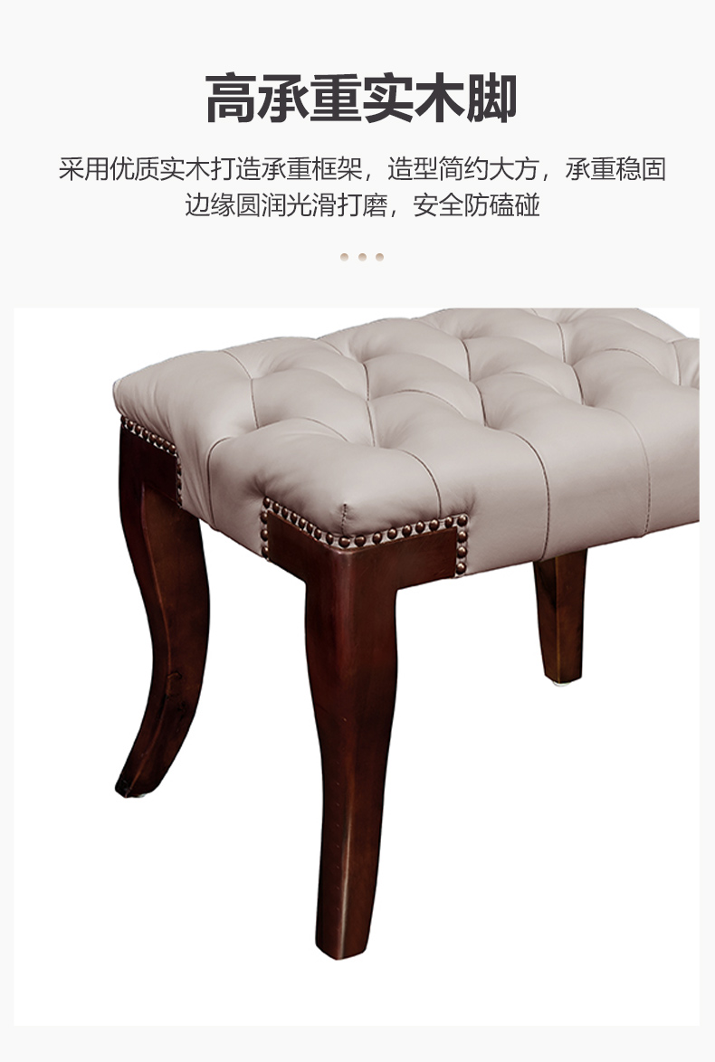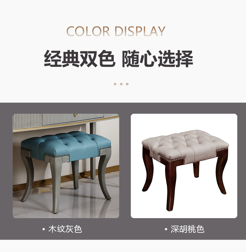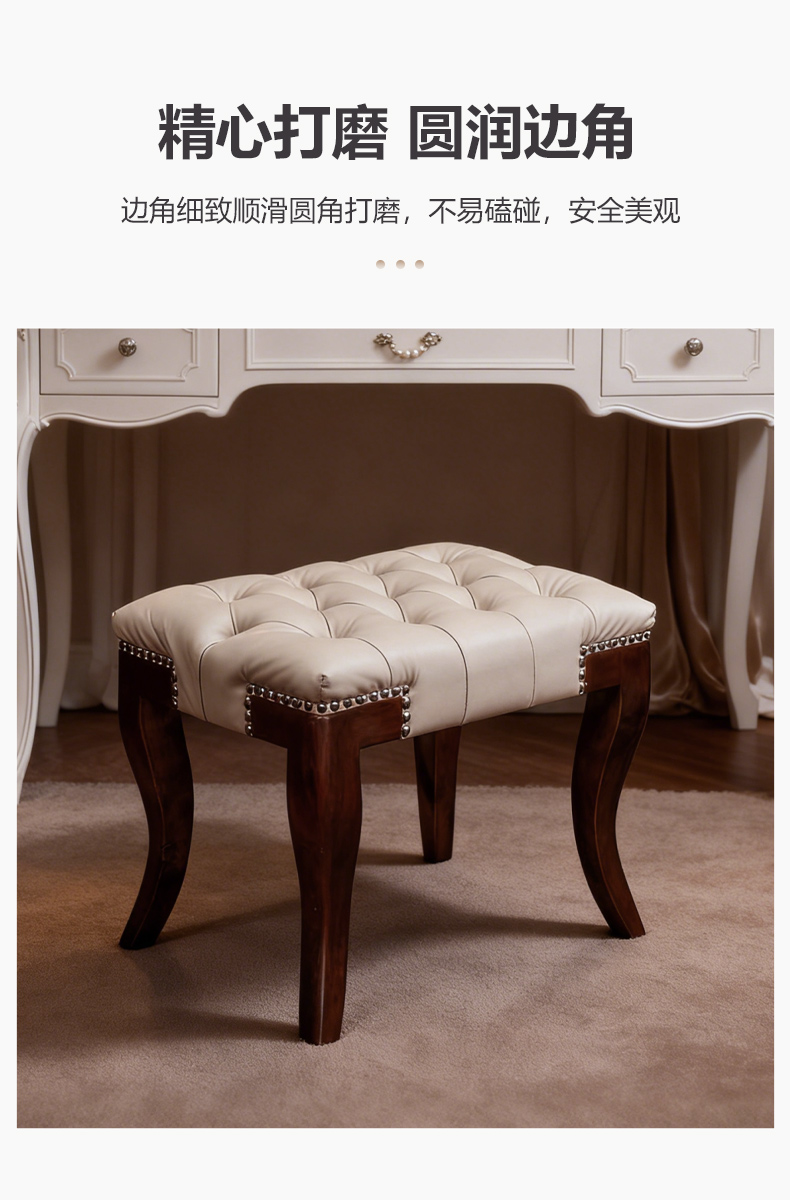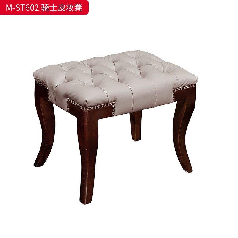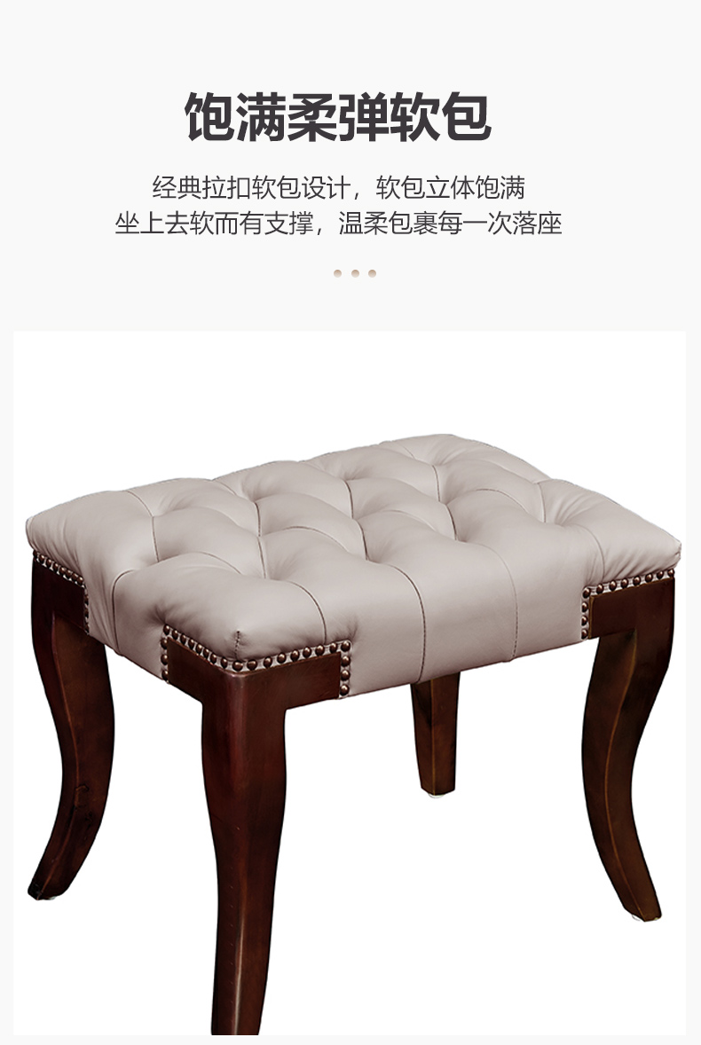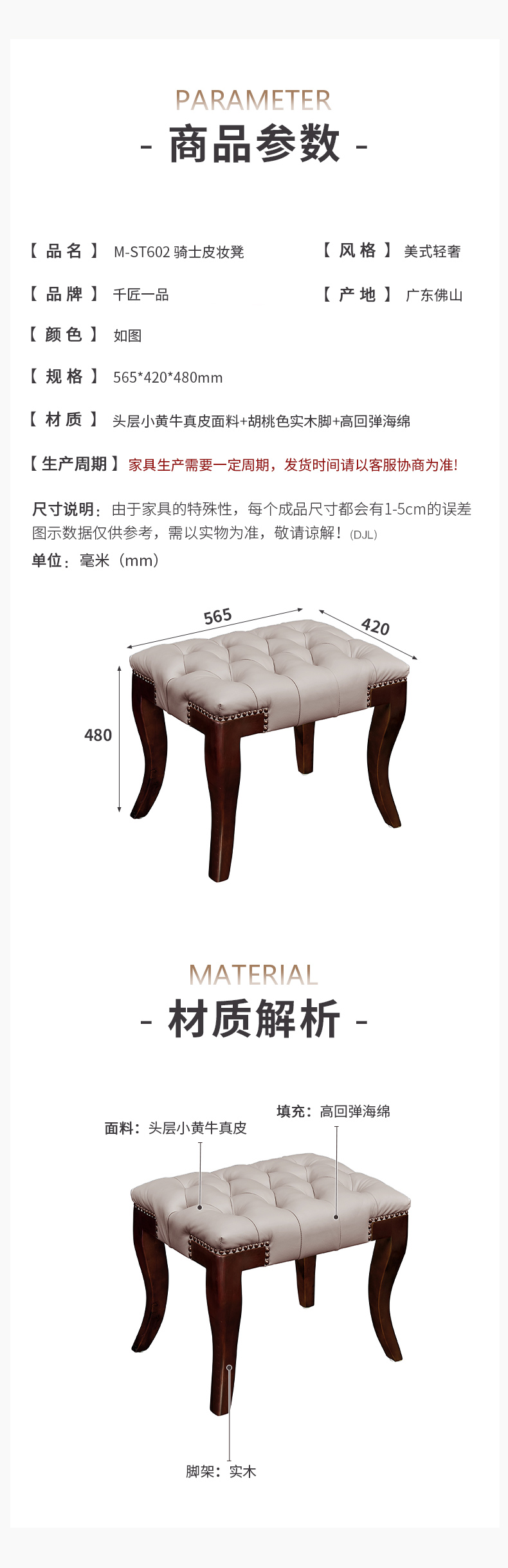 商品名称:【精品】千匠一品 美式轻奢风格 头层小黄牛真皮面料+胡桃色实木脚+高回弹海绵 时尚大气骑士皮妆凳M-ST602-J