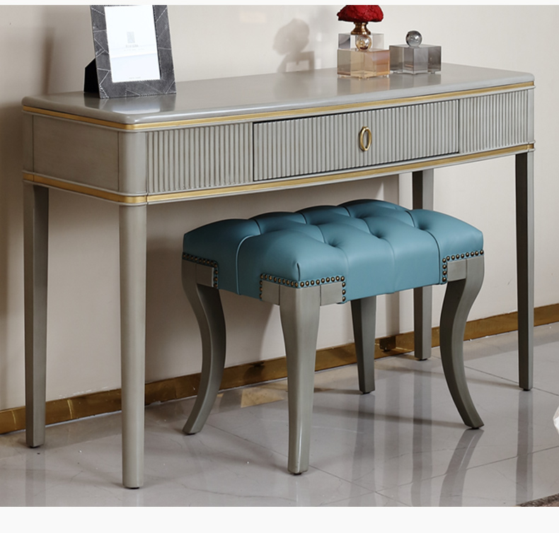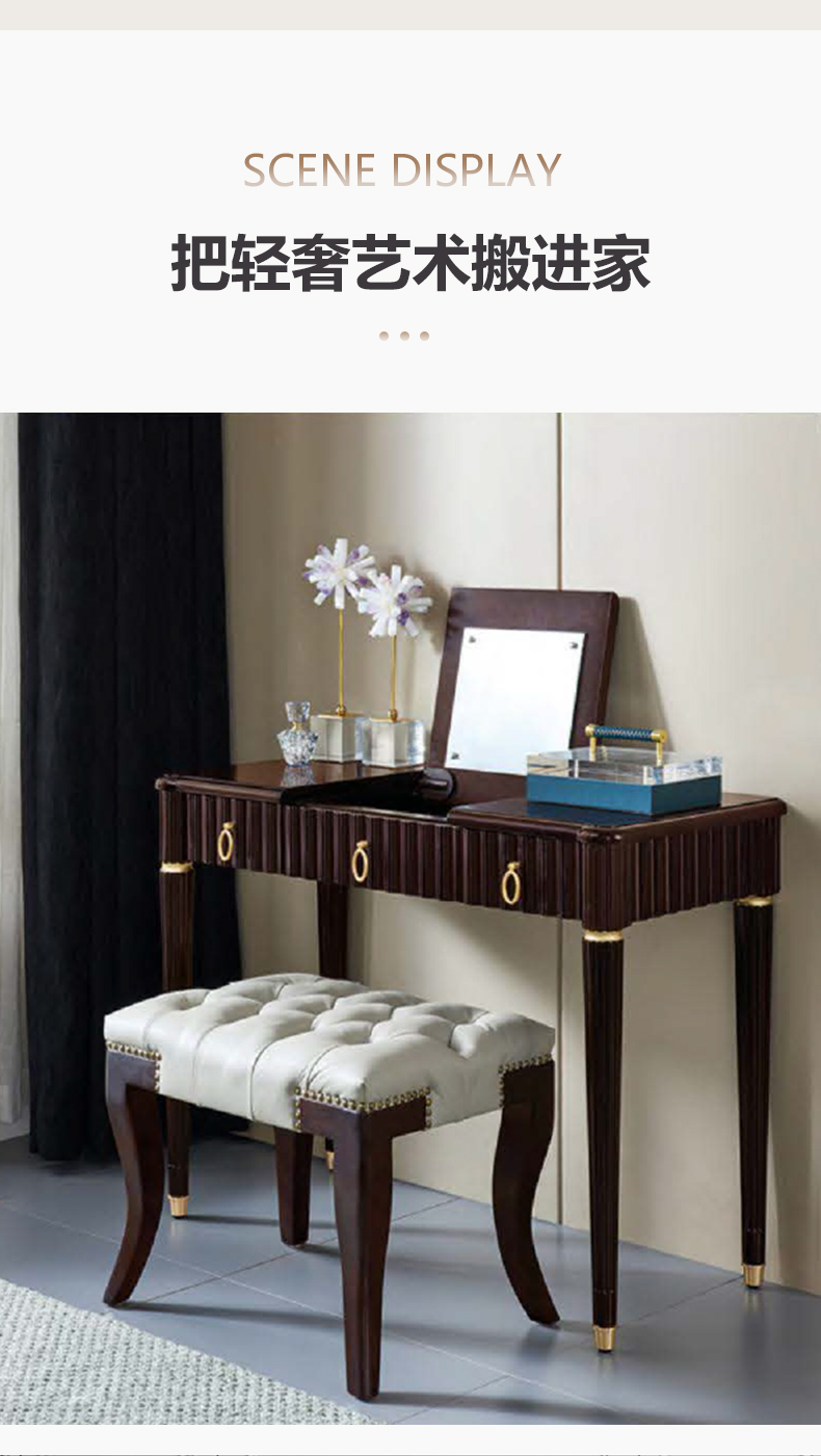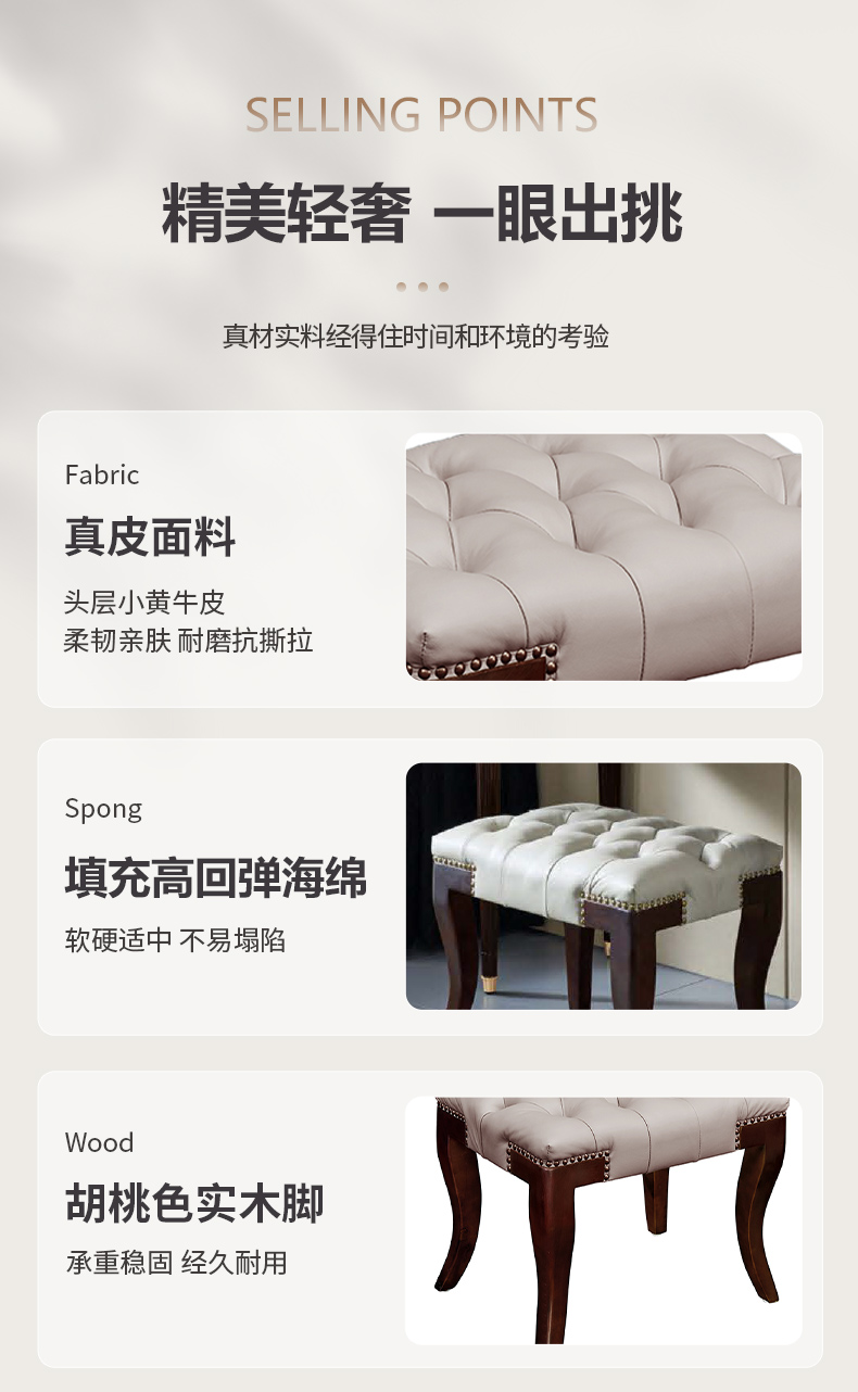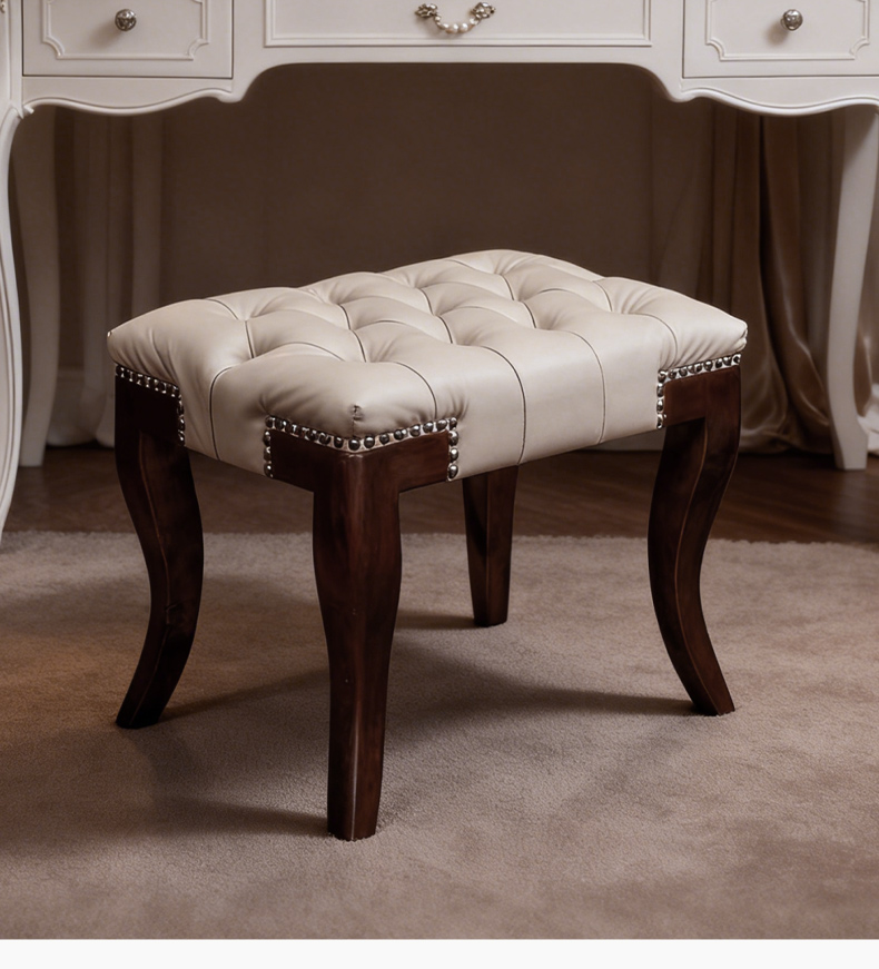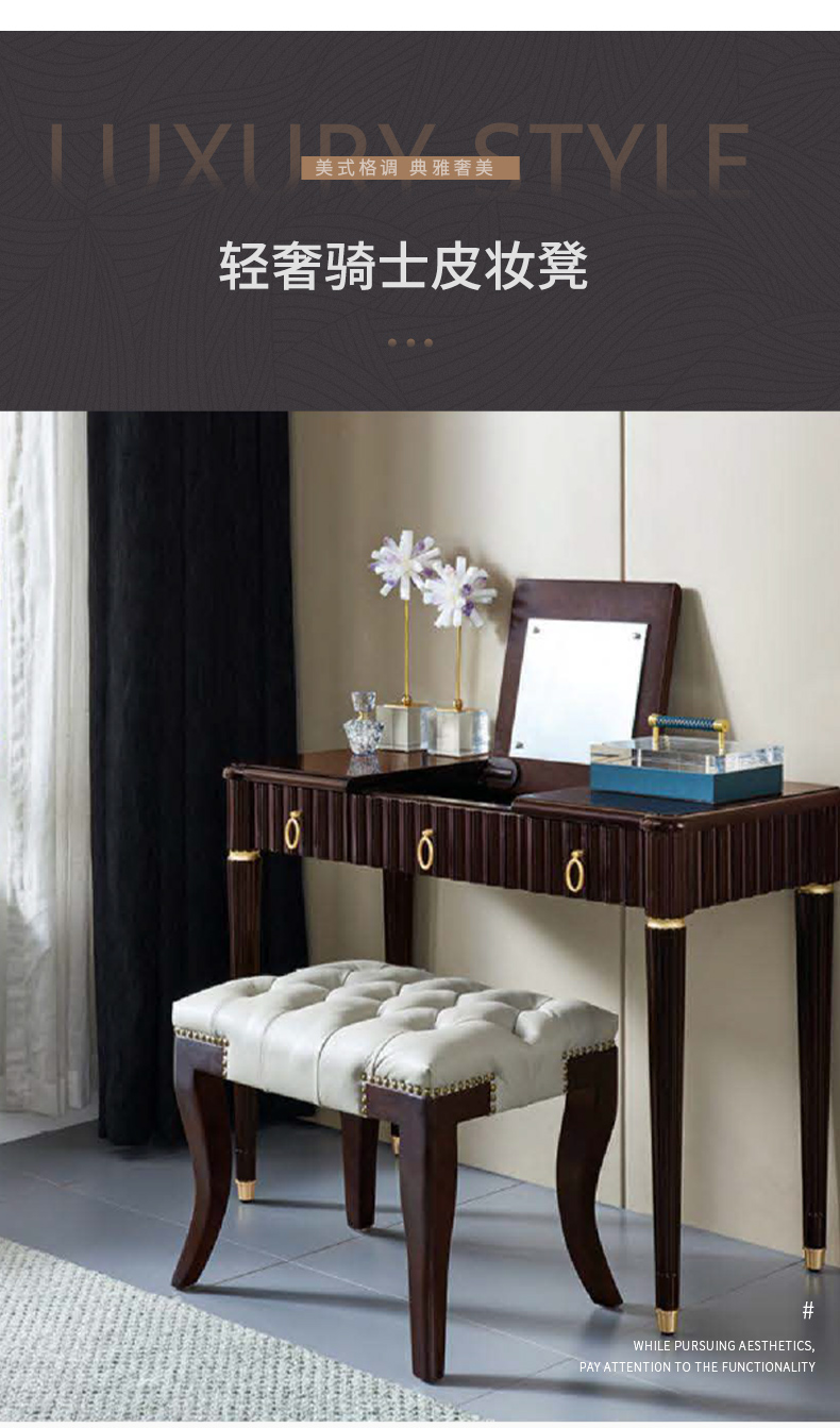 商品名称:【精品】千匠一品 美式轻奢风格 头层小黄牛真皮面料+胡桃色实木脚+高回弹海绵 时尚大气骑士皮妆凳M-ST602-J