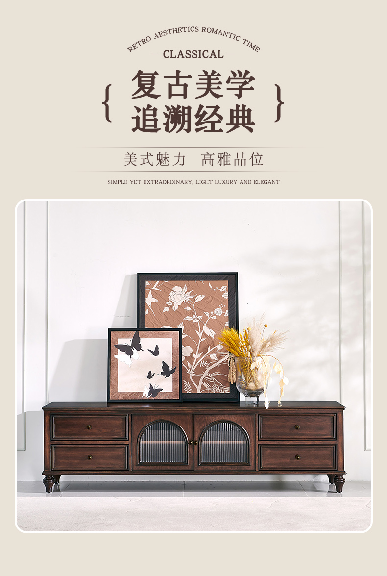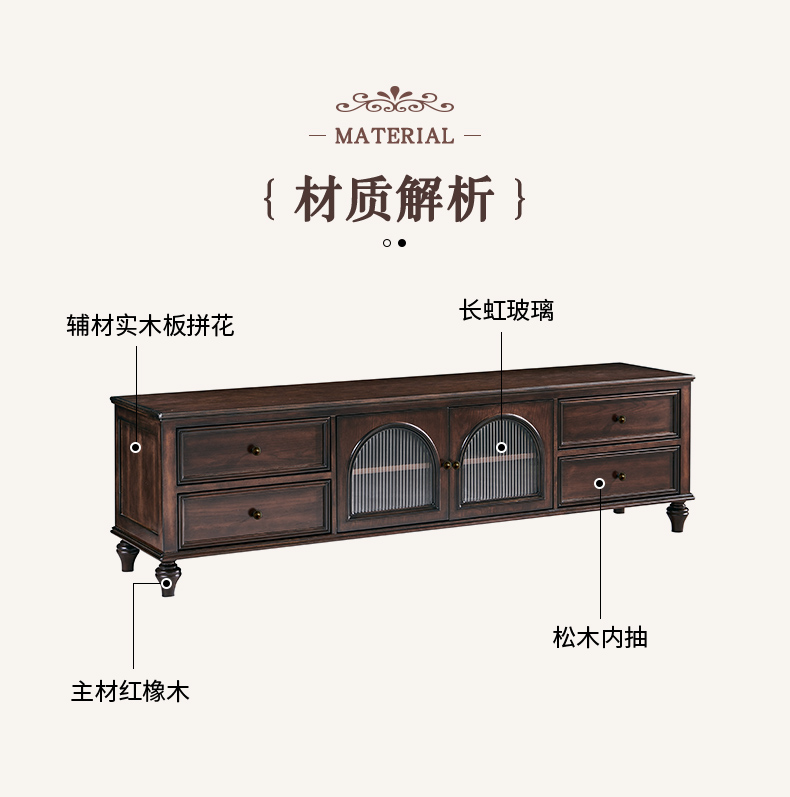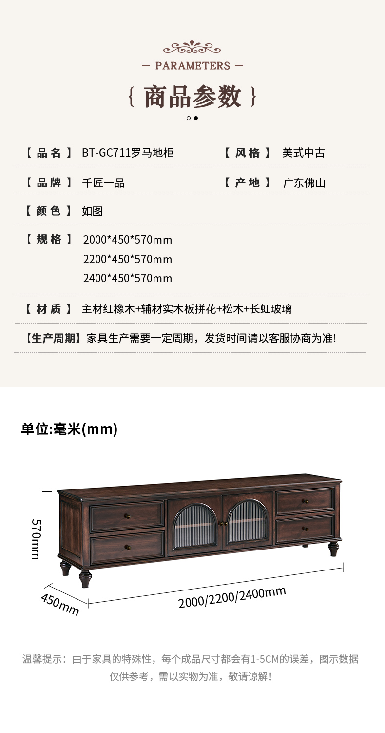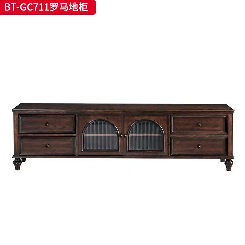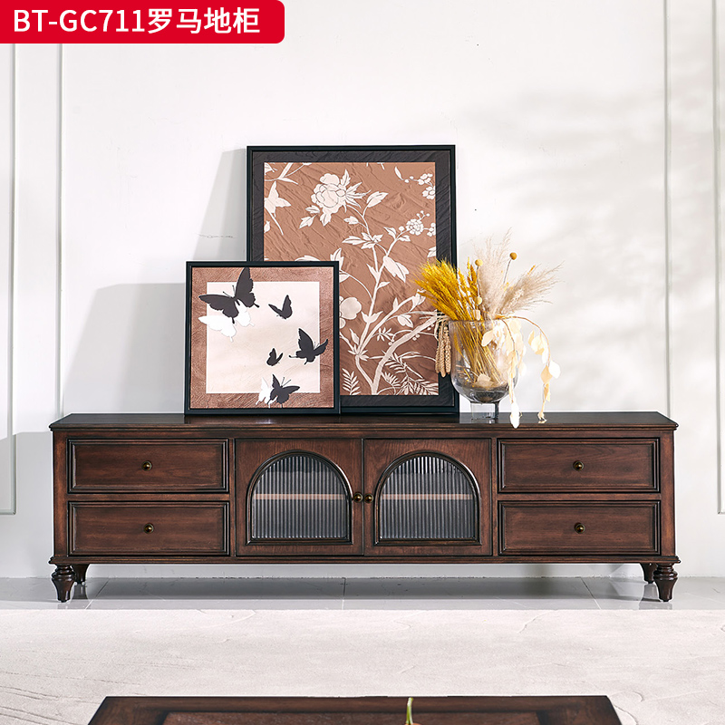 商品名称:【精品】千匠一品 美式中古风格 主材红橡木+辅材实木板拼花+松木+长虹玻璃 时尚大气罗马地柜BT-GC711-J