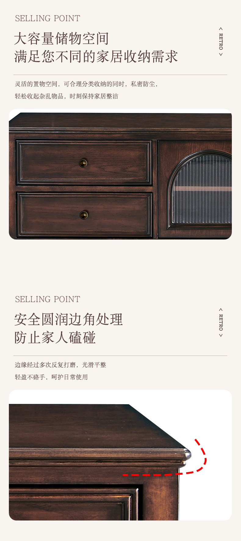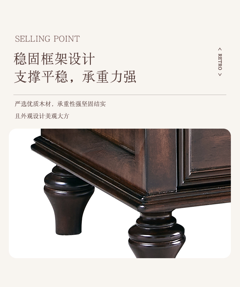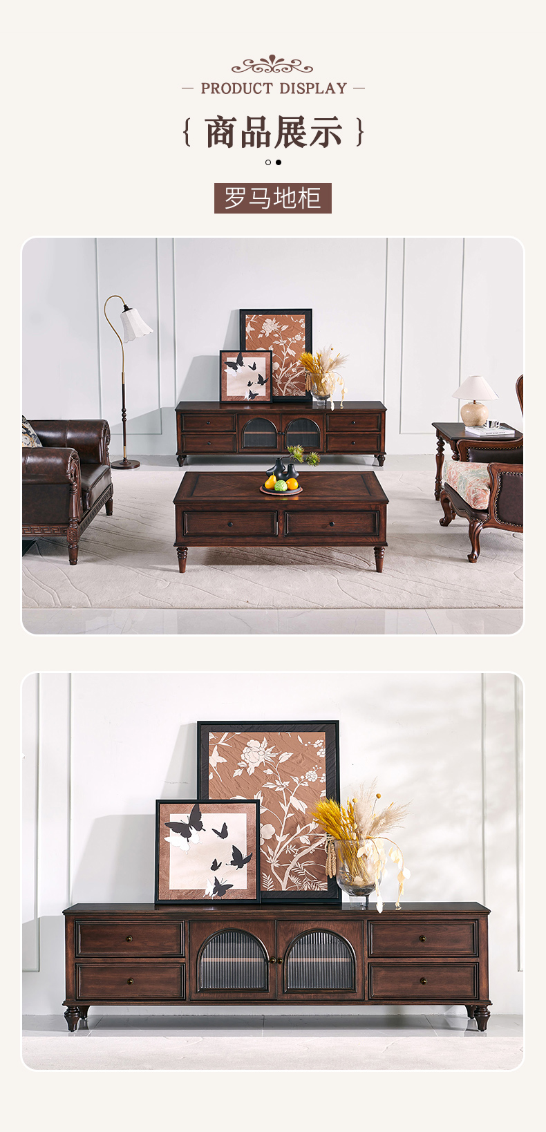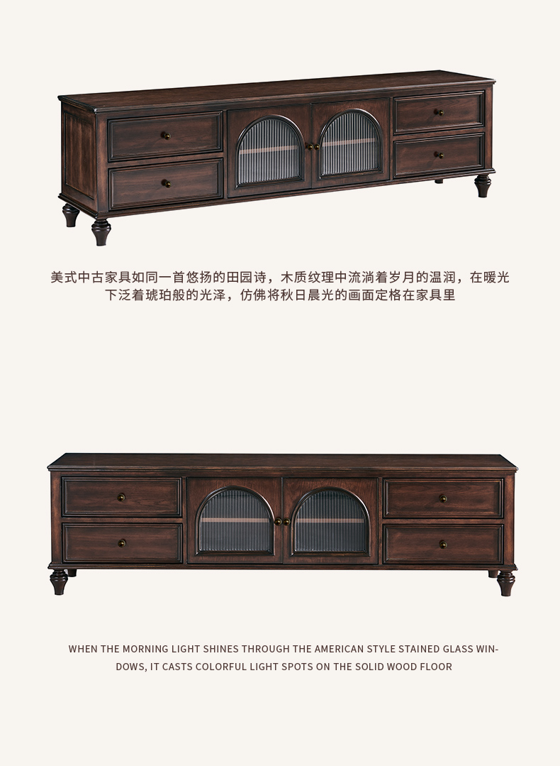 商品名称:【精品】千匠一品 美式中古风格 主材红橡木+辅材实木板拼花+松木+长虹玻璃 时尚大气罗马地柜BT-GC711-J