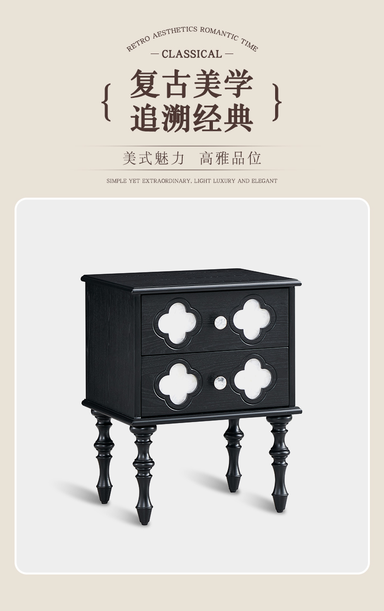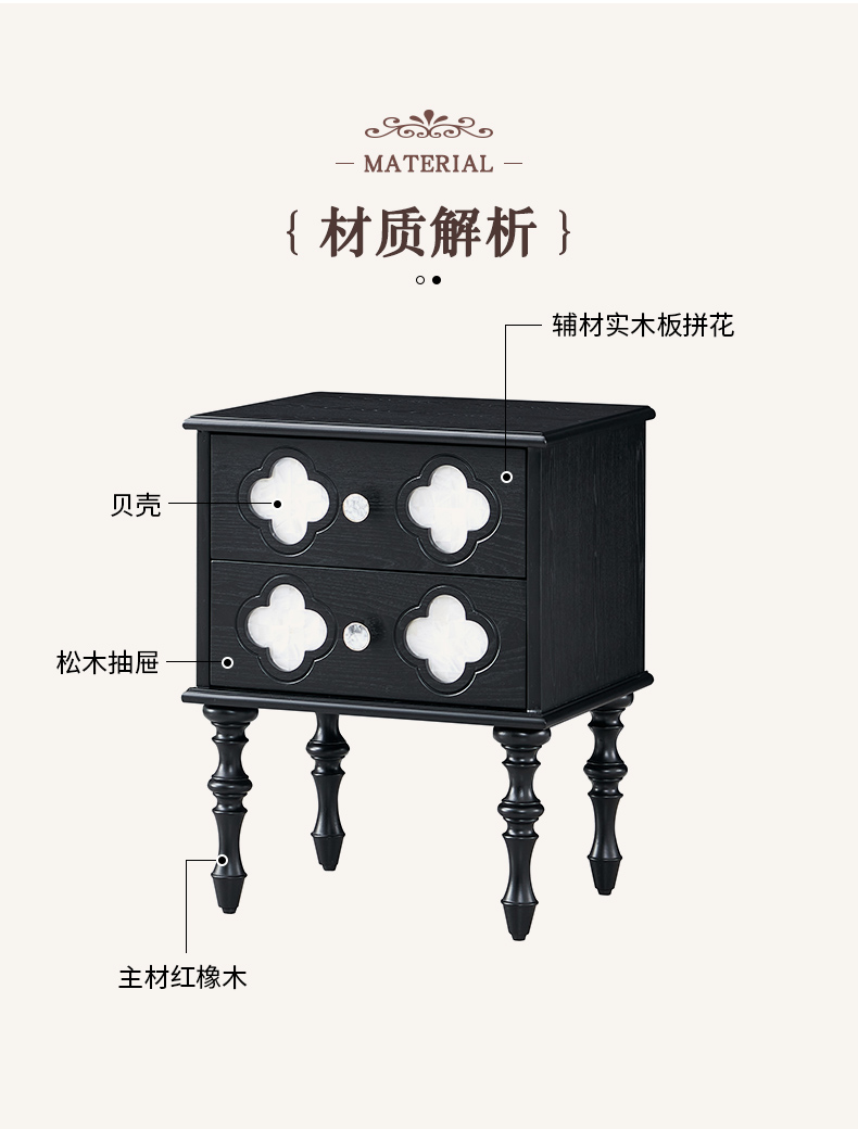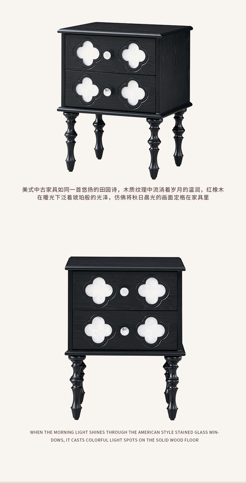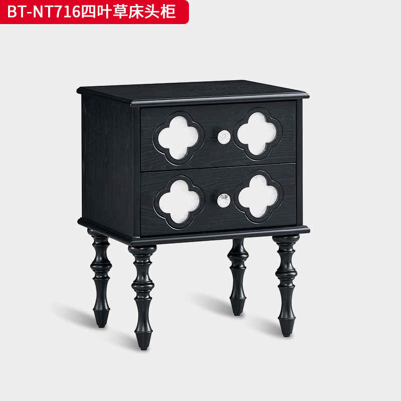 商品名称:【精品】千匠一品 美式中古风格 主材红橡木+辅材实木板拼花+松木+贝壳 时尚大气四叶草床头柜BT-NT716-J