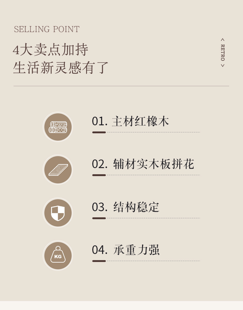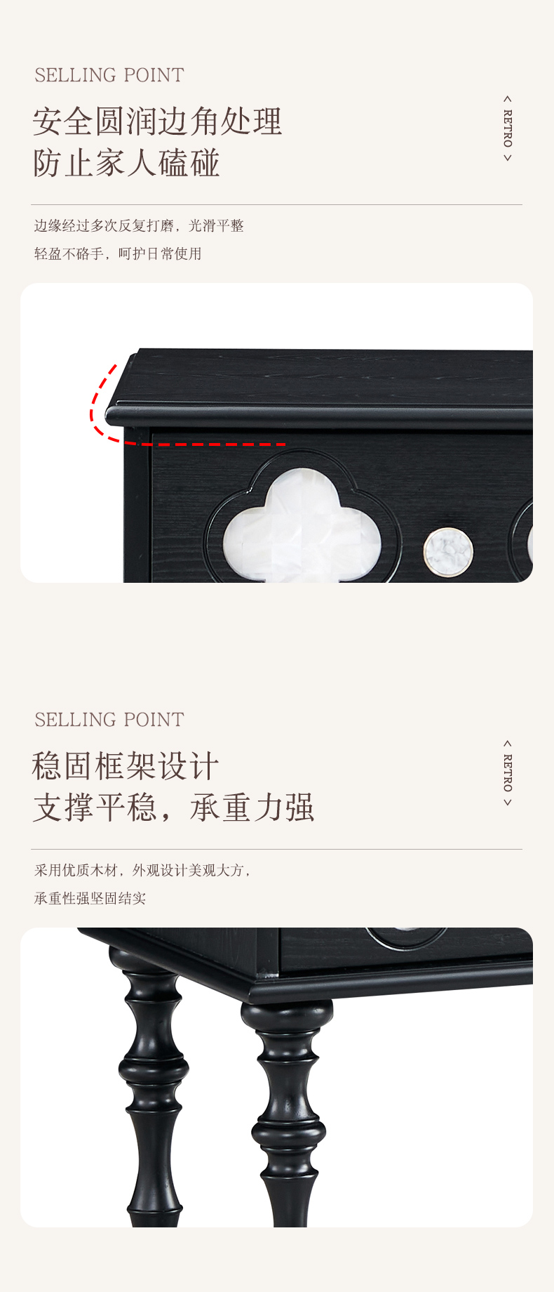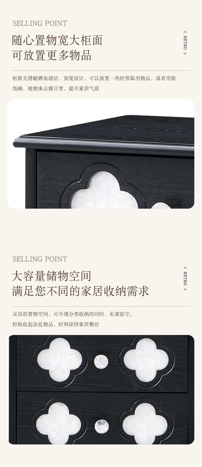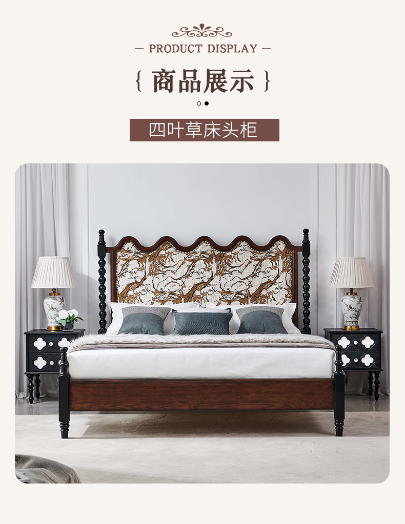 商品名称:【精品】千匠一品 美式中古风格 主材红橡木+辅材实木板拼花+松木+贝壳 时尚大气四叶草床头柜BT-NT716-J