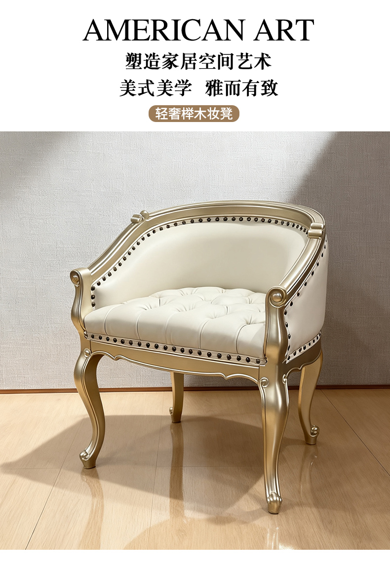 【精品】千匠一品 美式轻奢风格 榉木+软包+超纤皮 真皮 时尚大气妆凳M-ST802-J