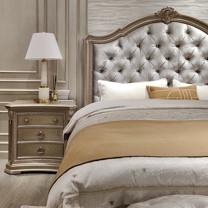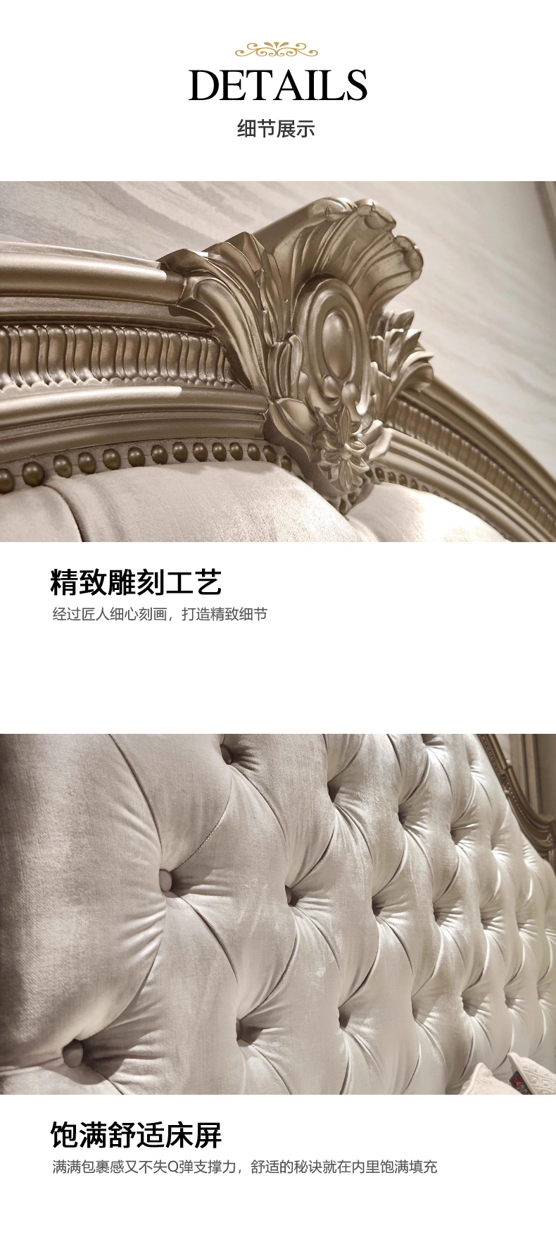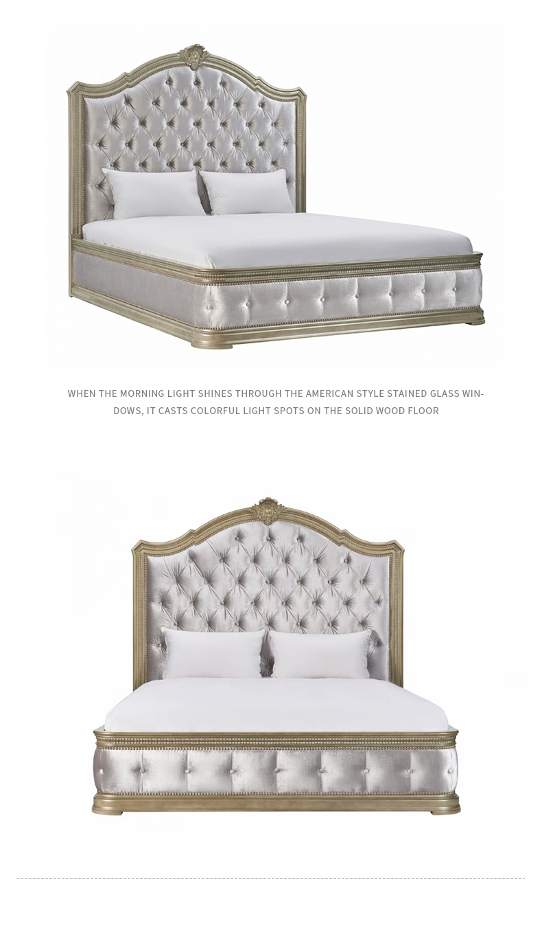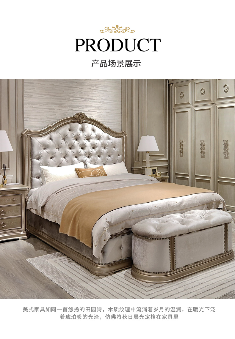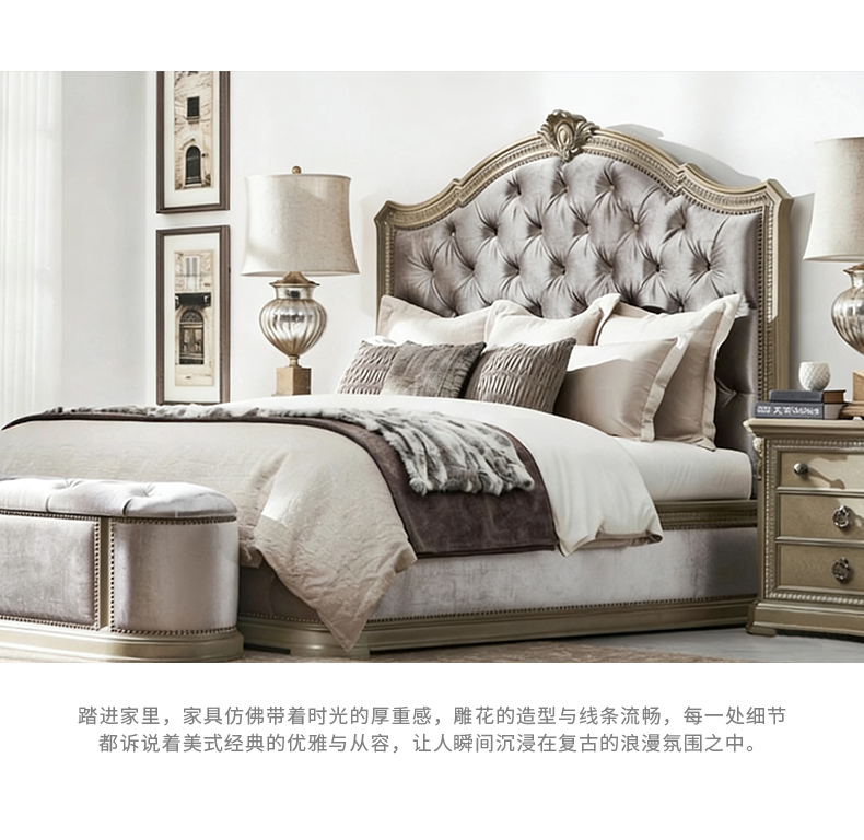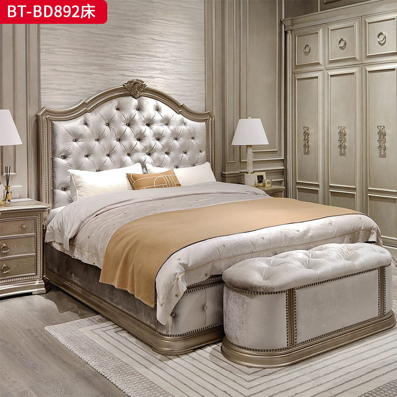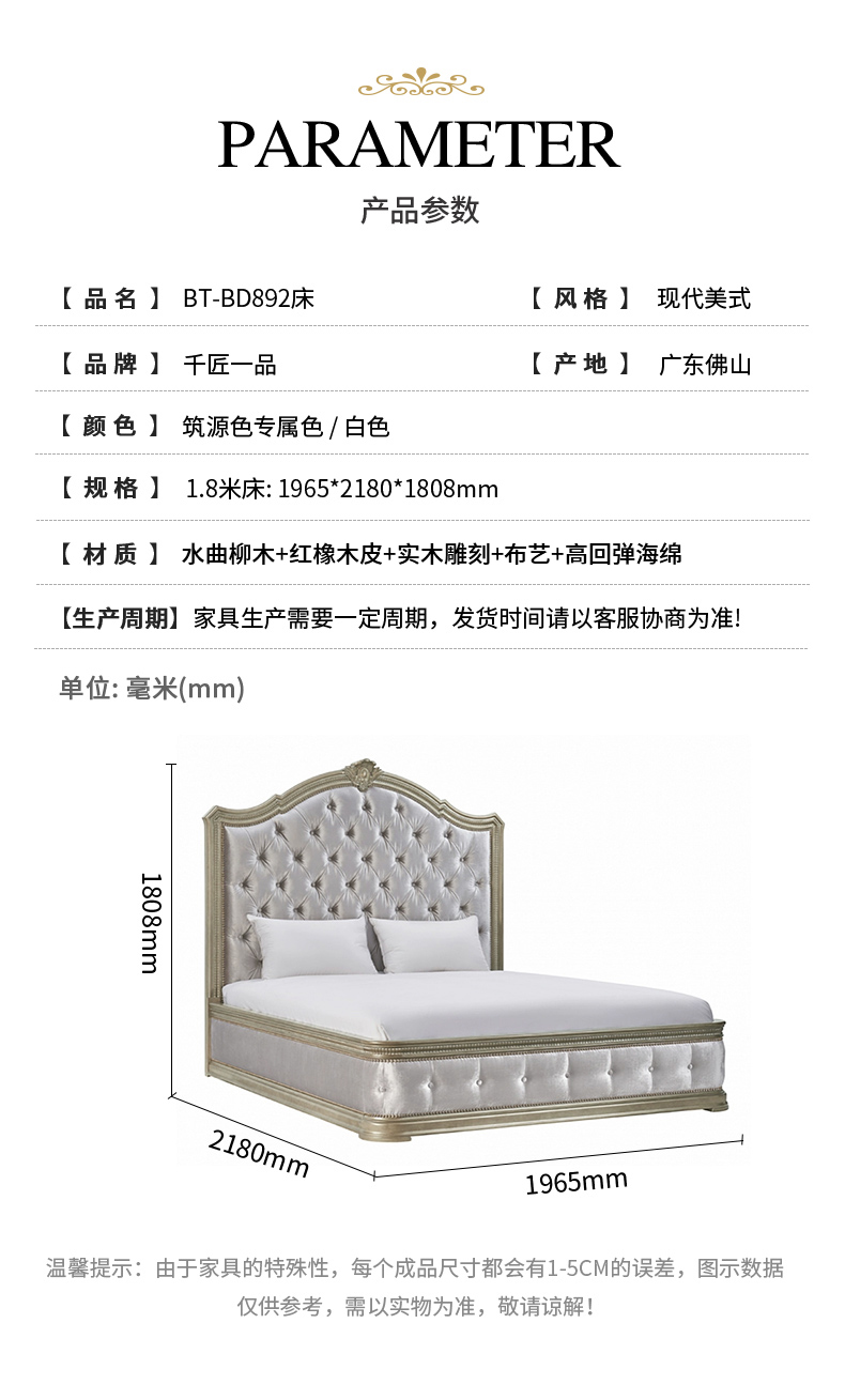 商品名称:【精品】千匠一品 现代美式风格 水曲柳木+红橡木皮+实木雕刻+布艺+高回弹海绵 时尚大气床BT-BD892-L