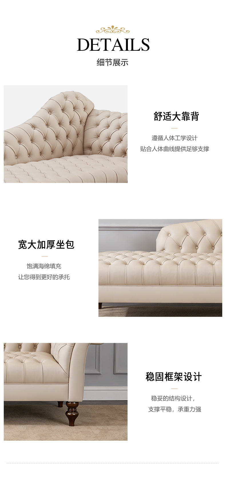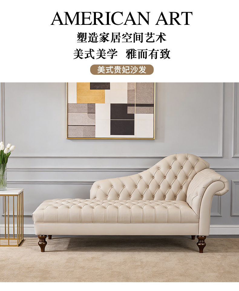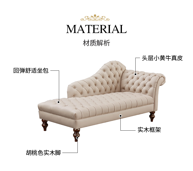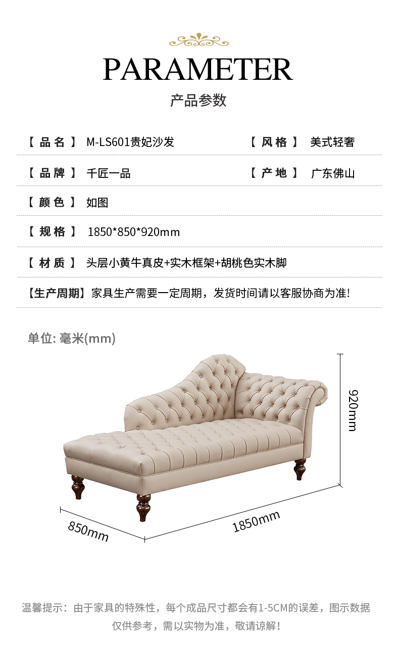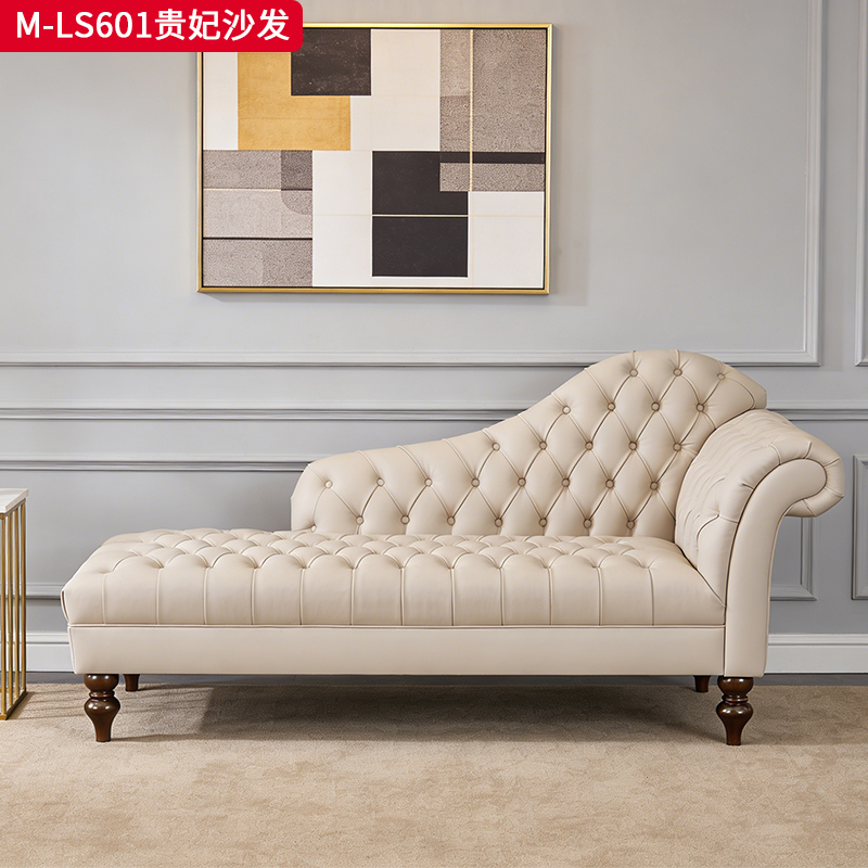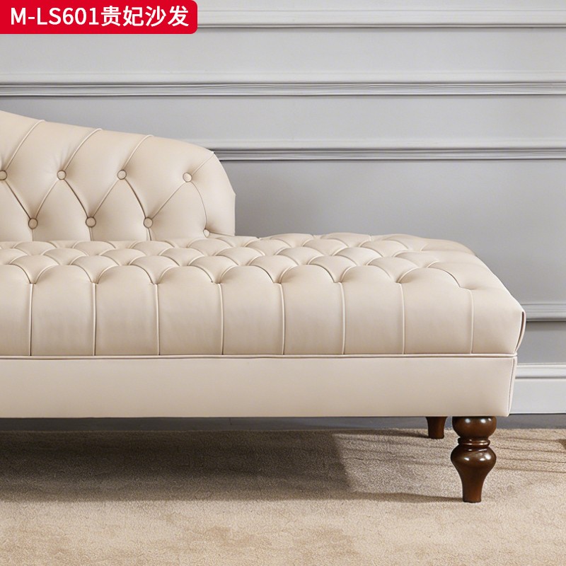 商品名称:【精品】千匠一品 美式轻奢风格 头层小黄牛真皮+实木框架+胡桃色实木脚 时尚大气贵妃沙发M-LS601-L