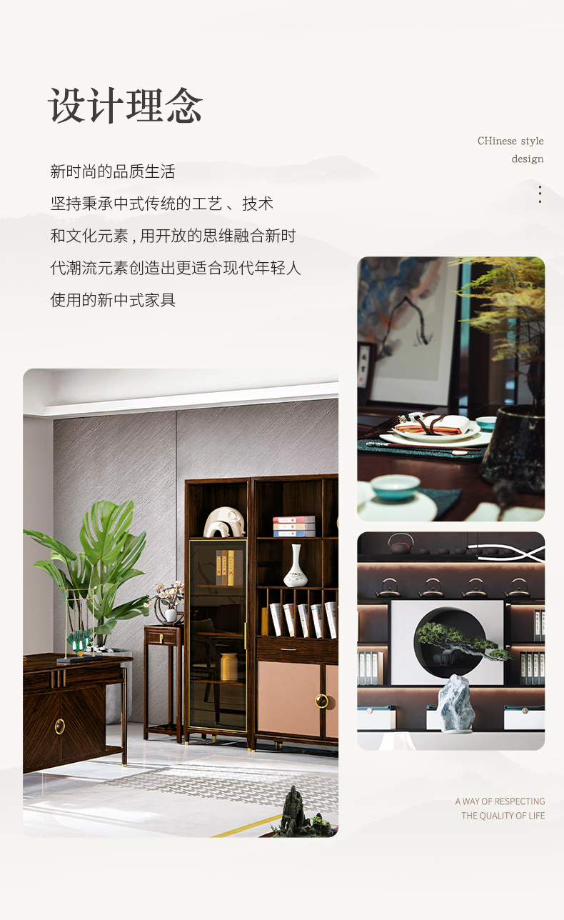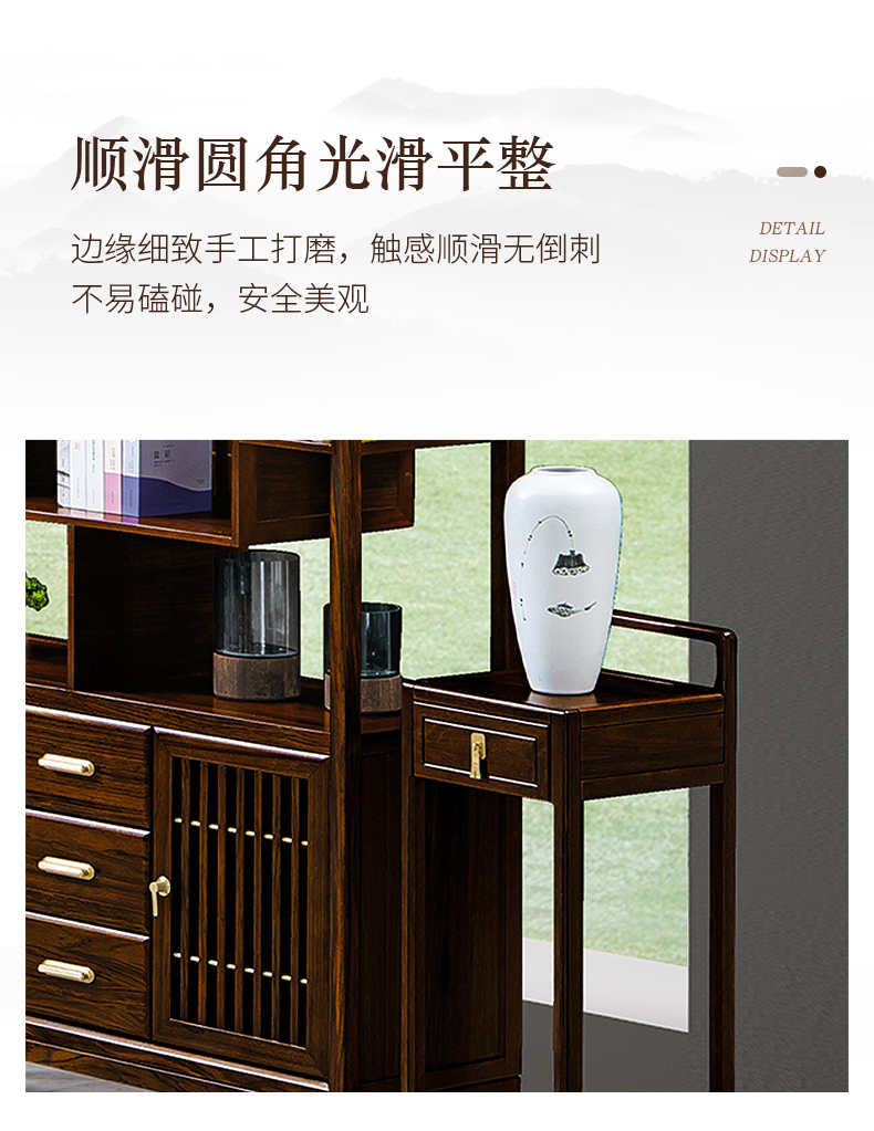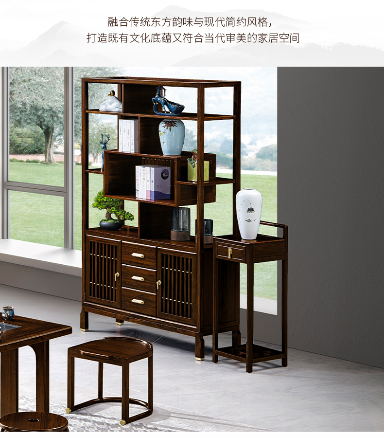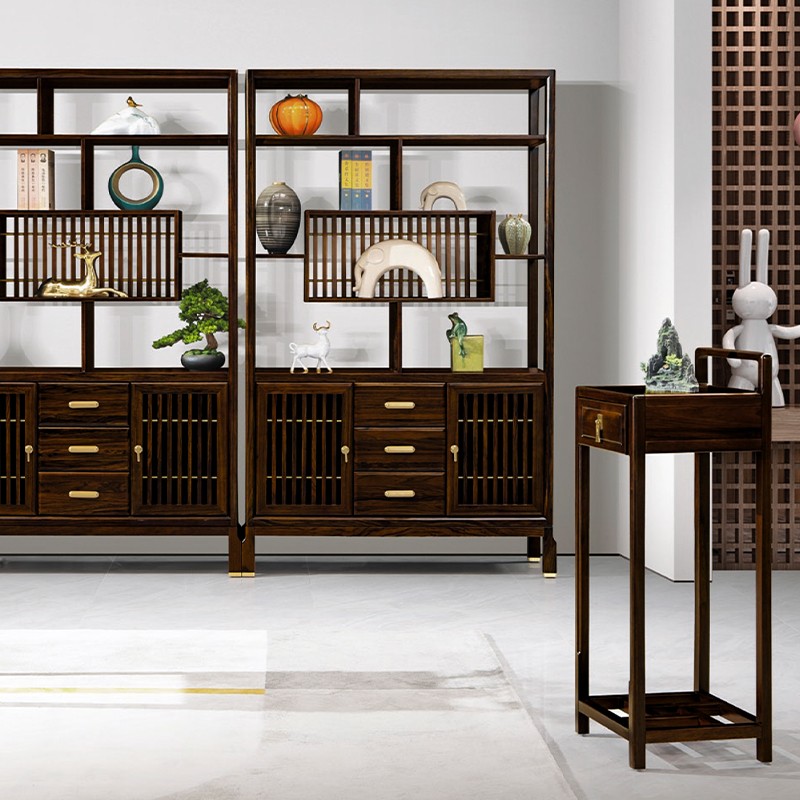 千匠一品 新中式风格 主材乌金木+辅材多层实木板贴乌金木皮+铜拉手 时尚大气博古架9920-L