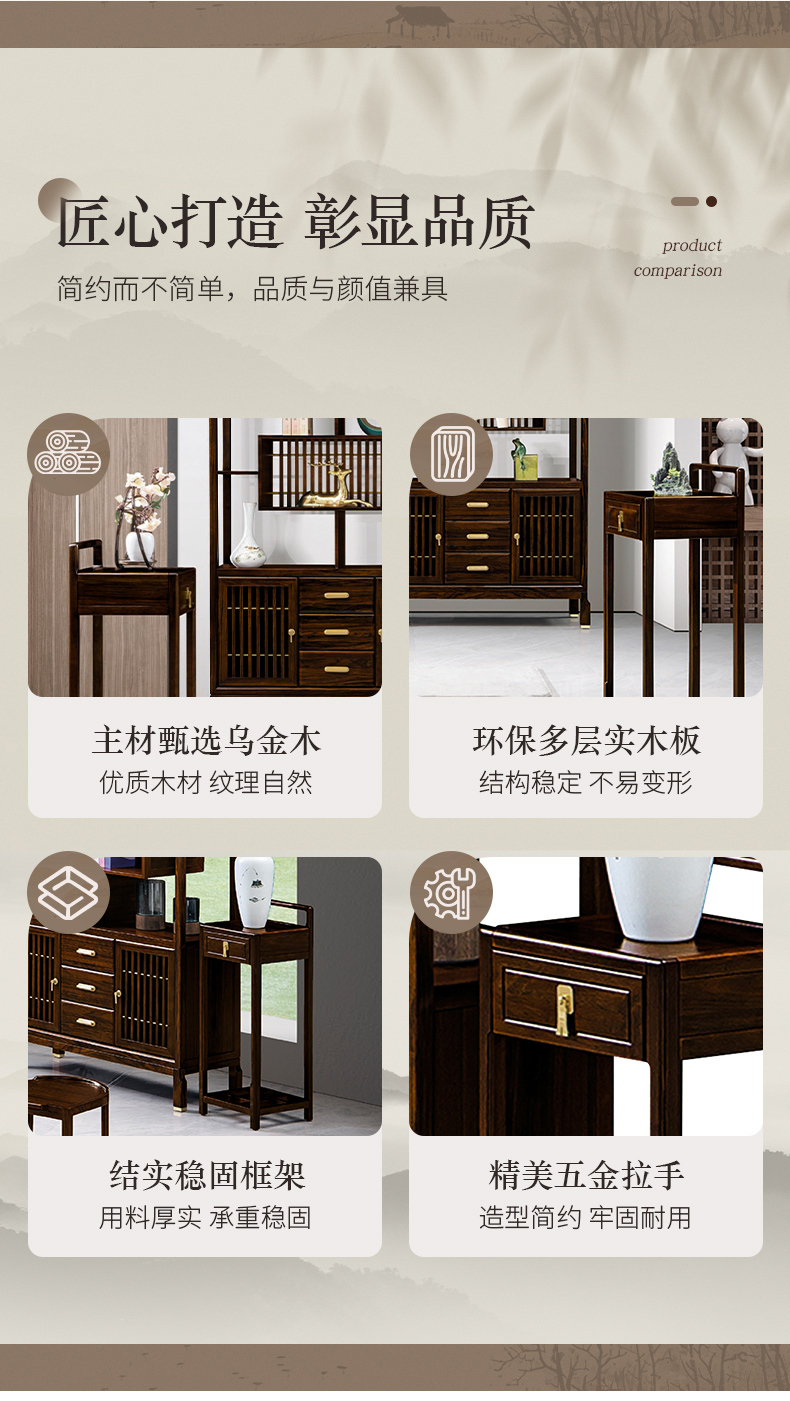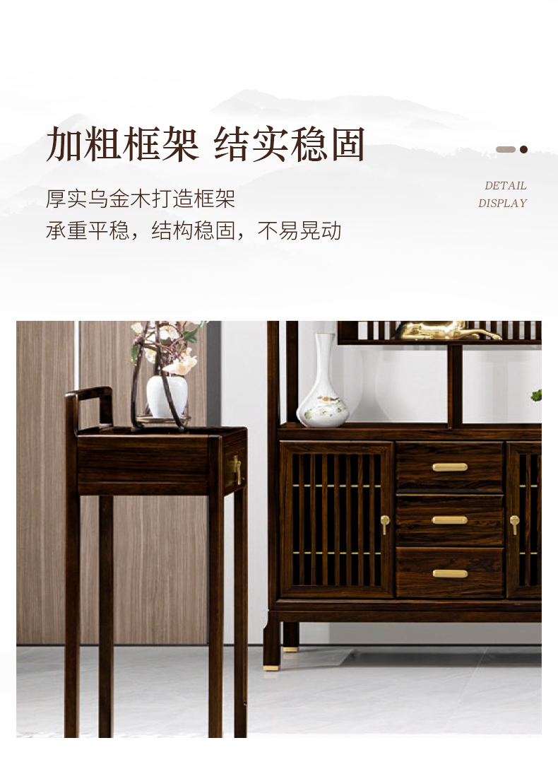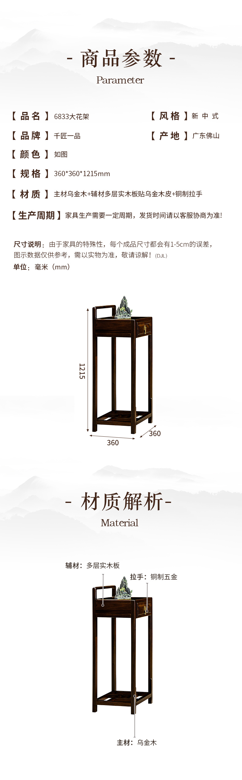 商品名称:千匠一品 新中式风格 主材乌金木+辅材多层实木板贴乌金木皮+铜制拉手 时尚大气花架6833-L