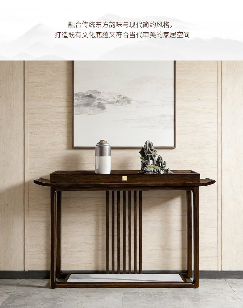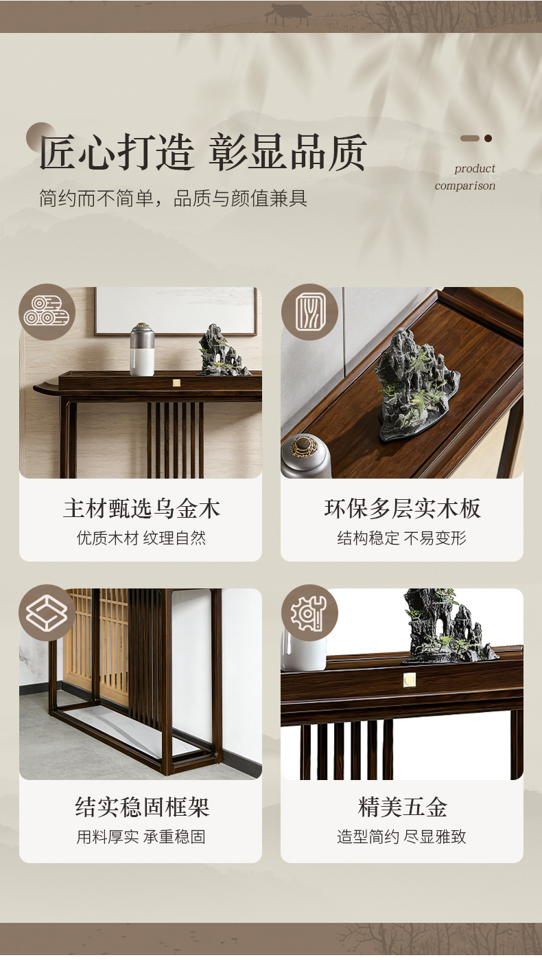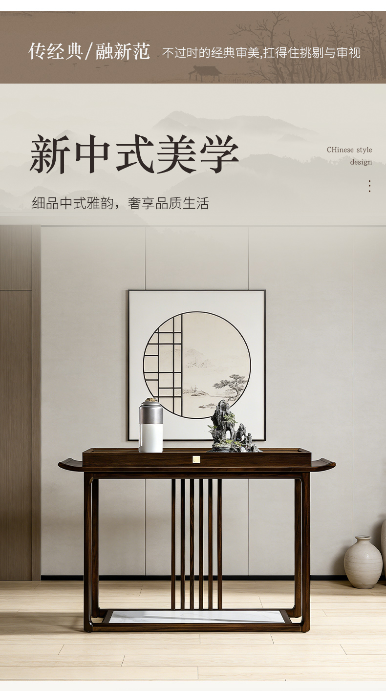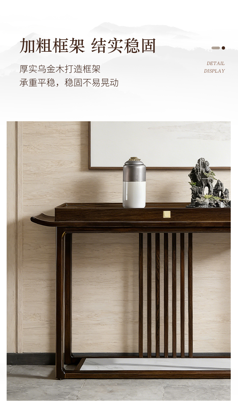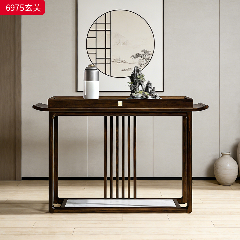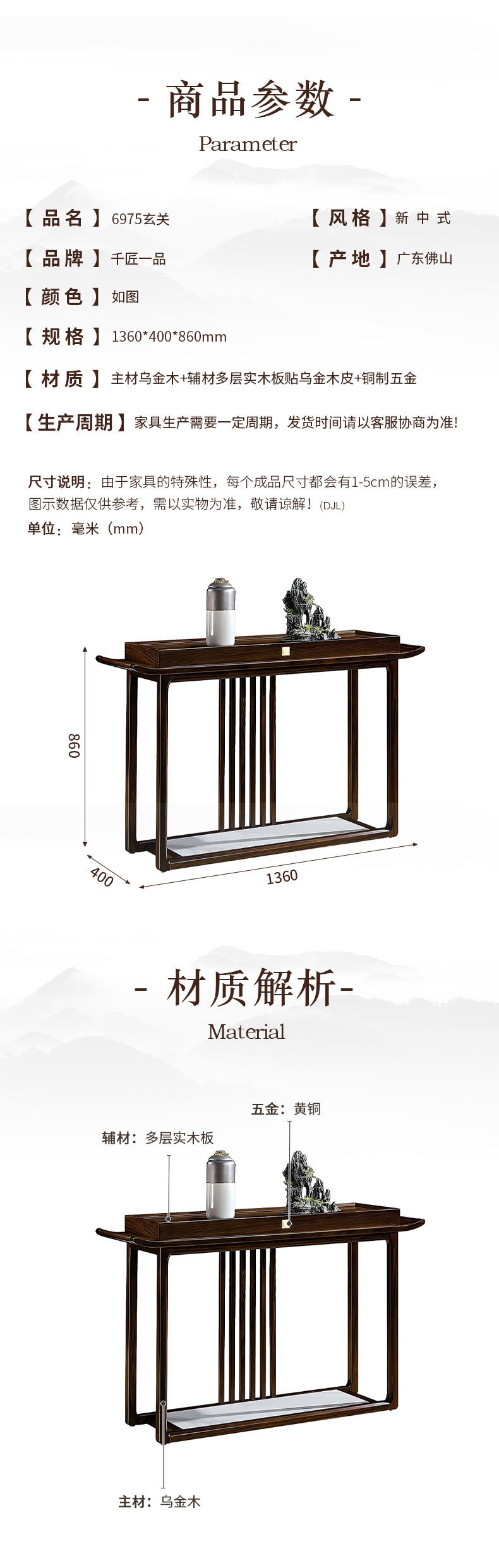 商品名称:千匠一品 新中式风格 主材乌金木+辅材多层实木板贴乌金木皮+铜制五金 时尚大气玄关6975-L