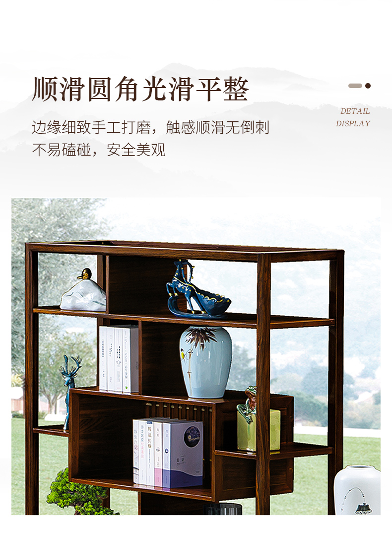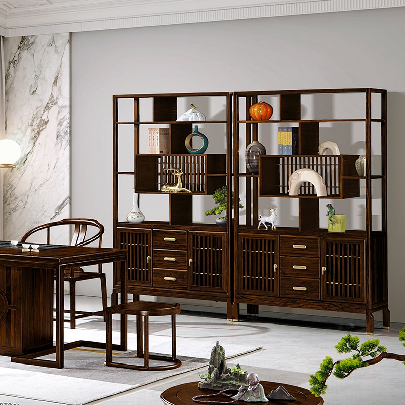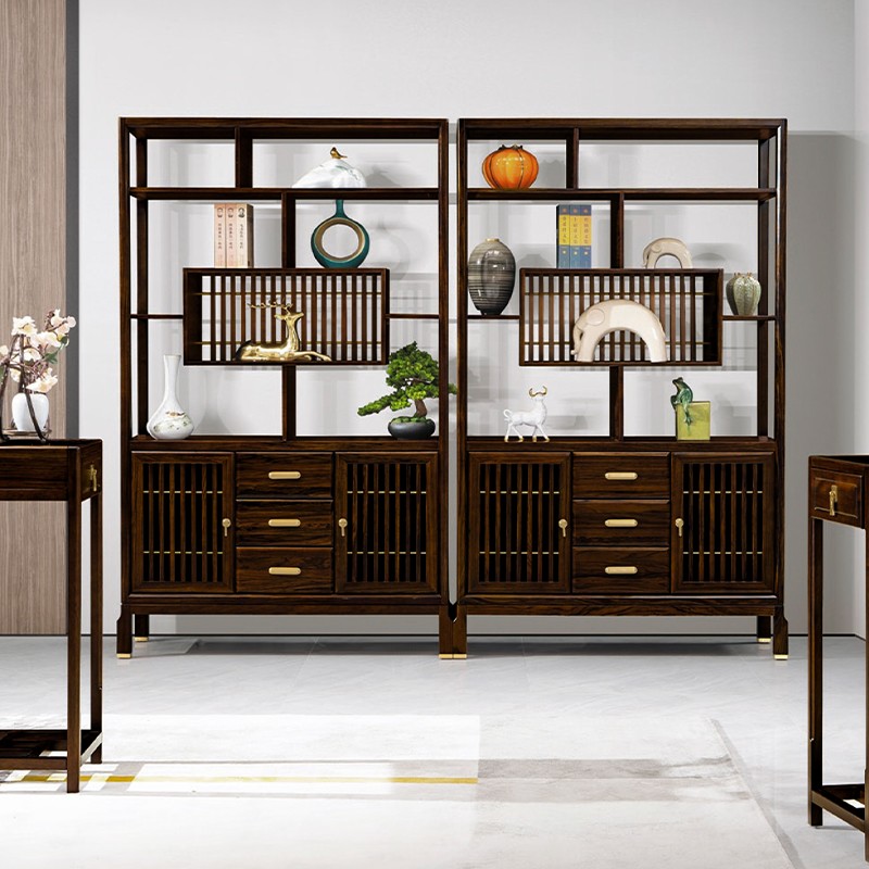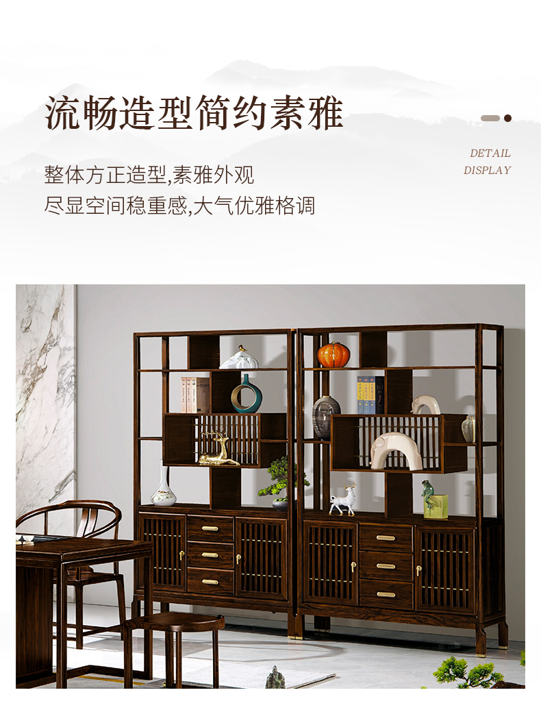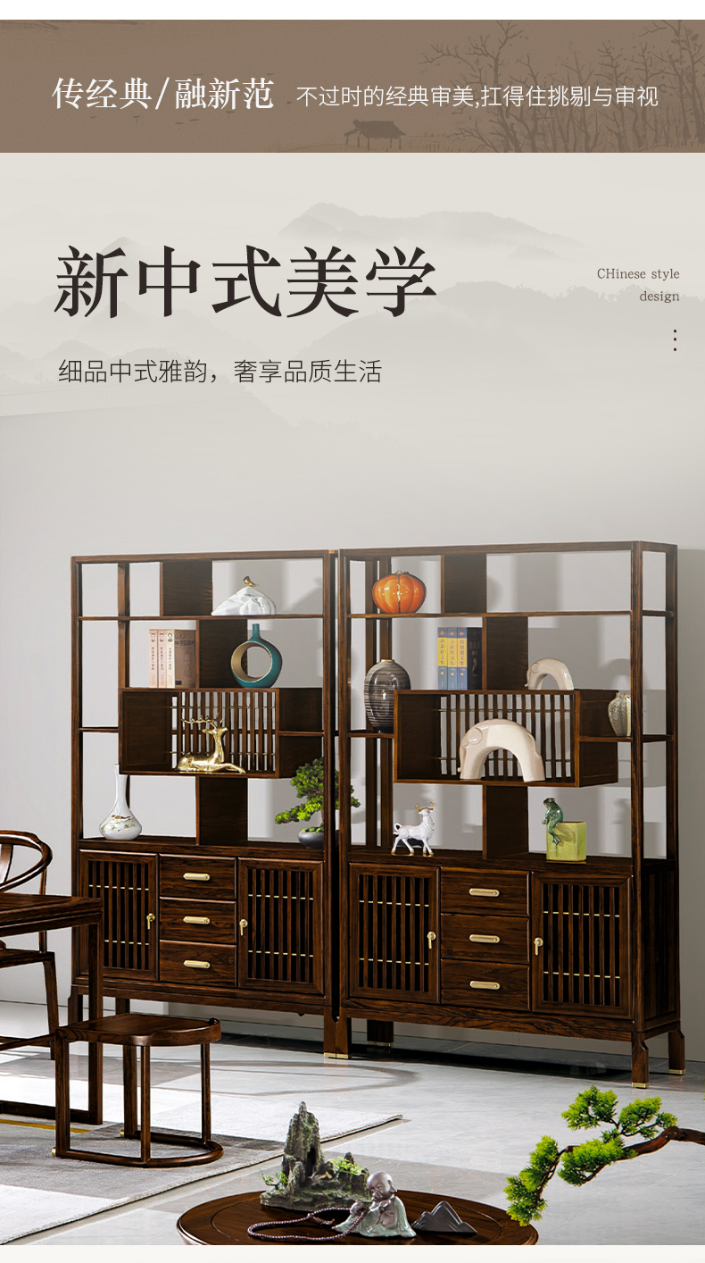 千匠一品 新中式风格 主材乌金木+辅材多层实木板贴乌金木皮+铜拉手 时尚大气博古架9920-L