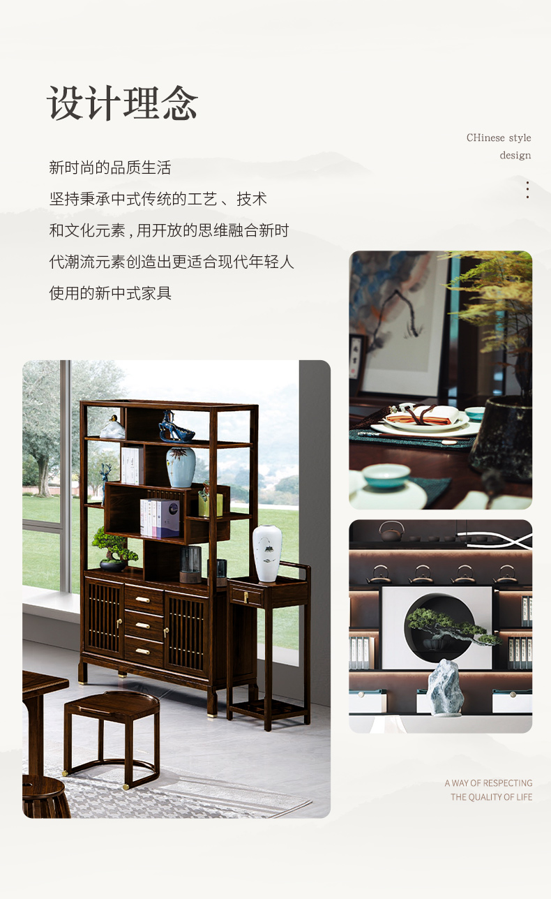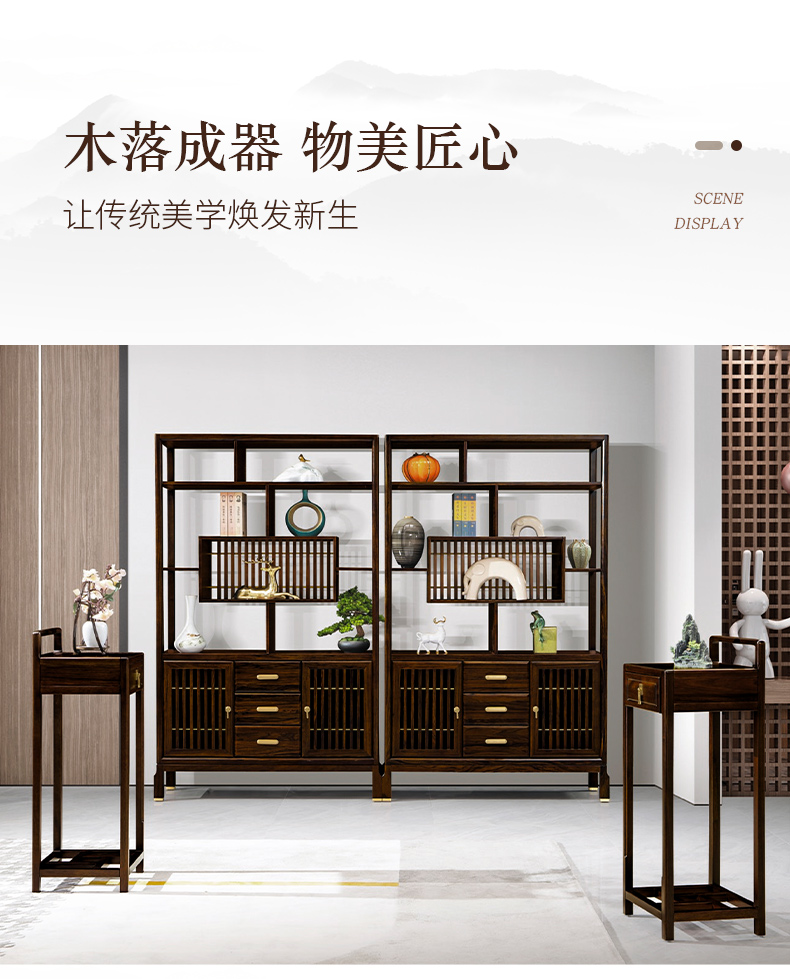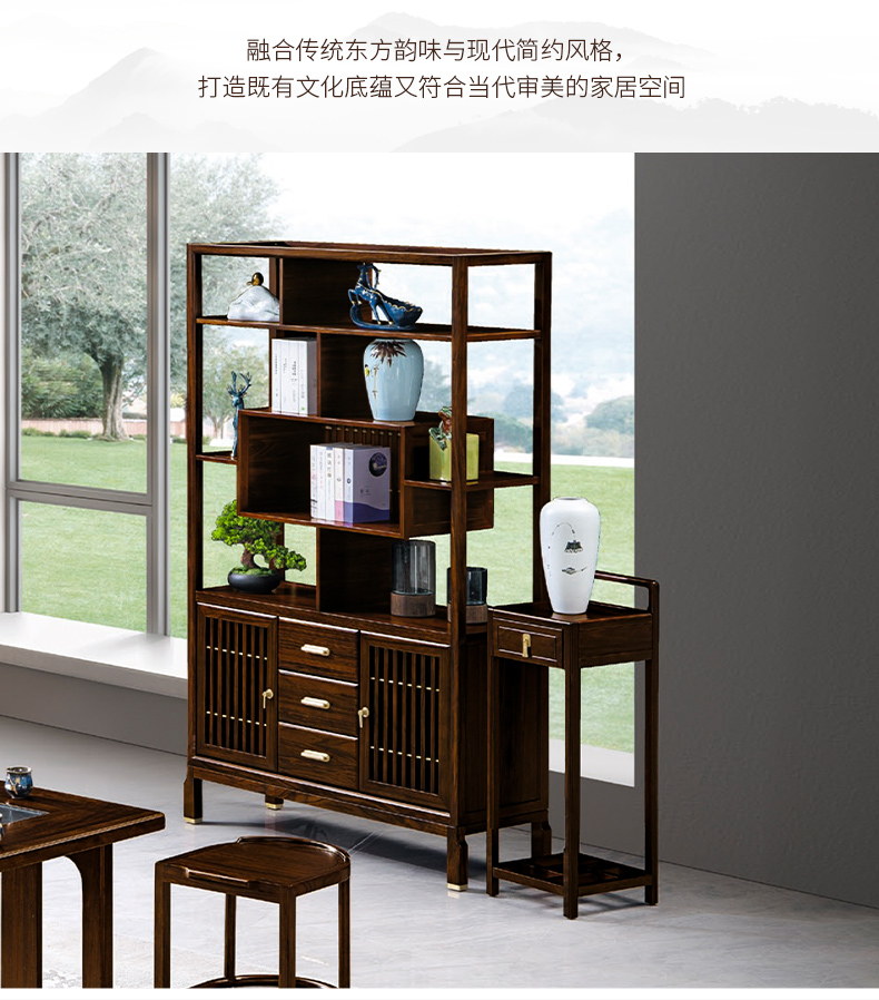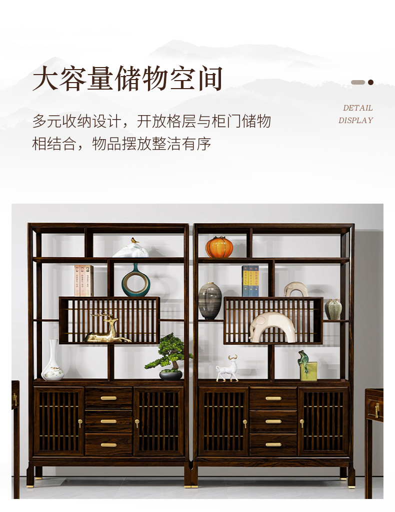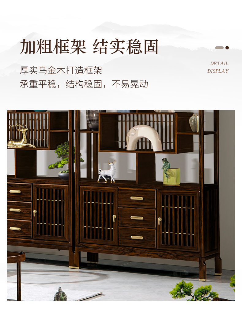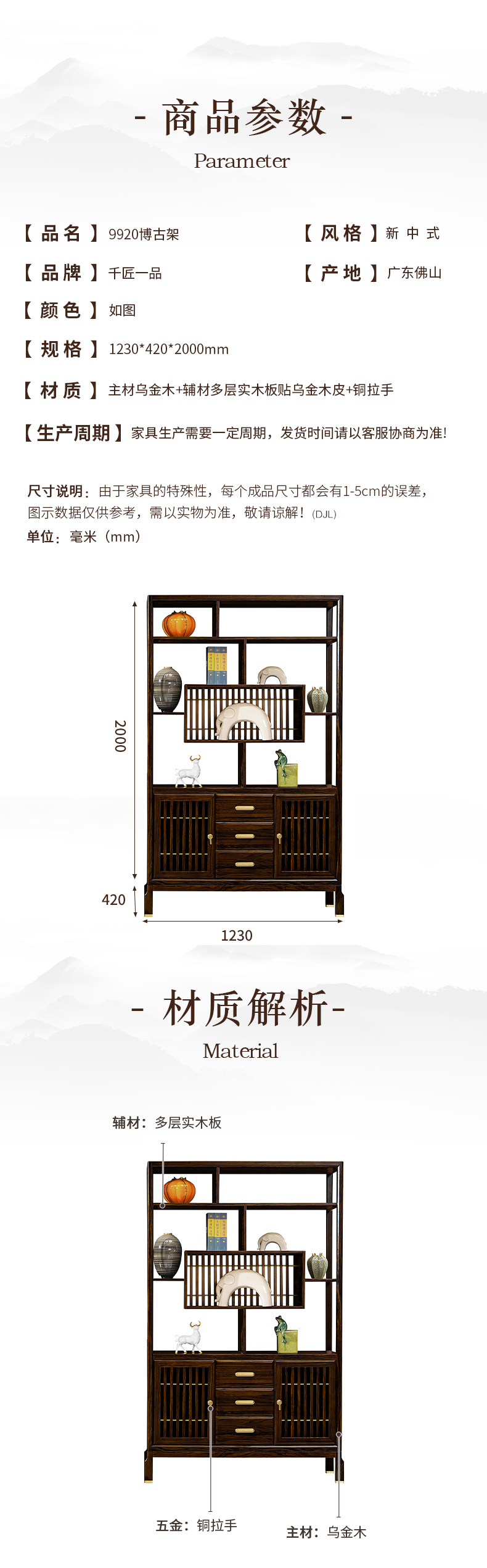 商品名称:千匠一品 新中式风格 主材乌金木+辅材多层实木板贴乌金木皮+铜拉手 时尚大气博古架9920-L