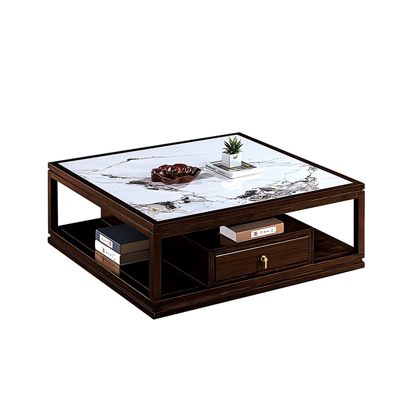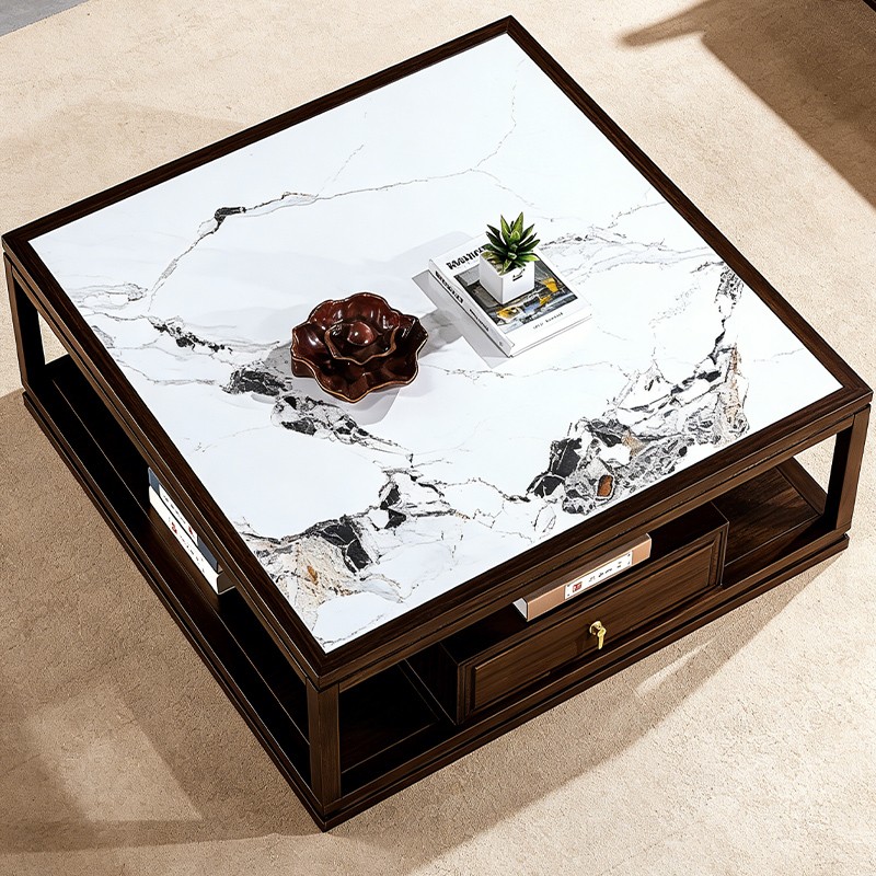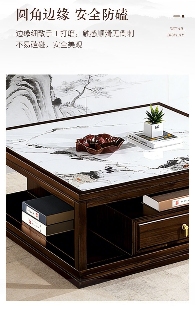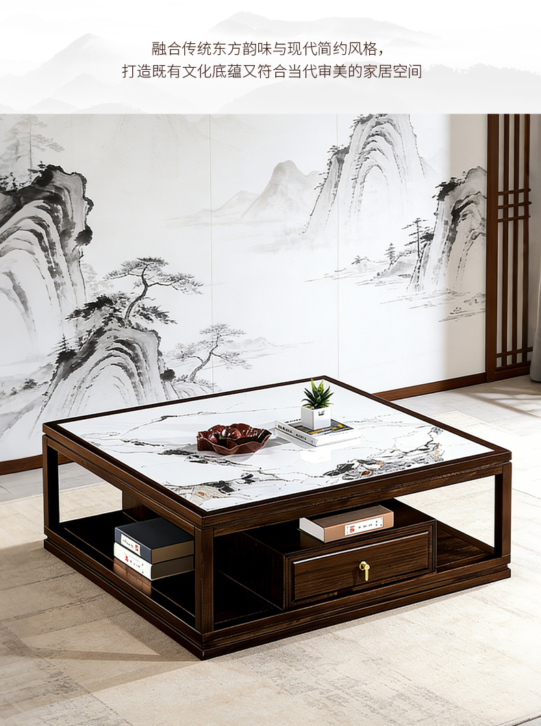 千匠一品 新中式风格 岩板+主材乌金木+辅材多层实木板贴乌金木皮+铜拉手 时尚优雅方茶几9823-J