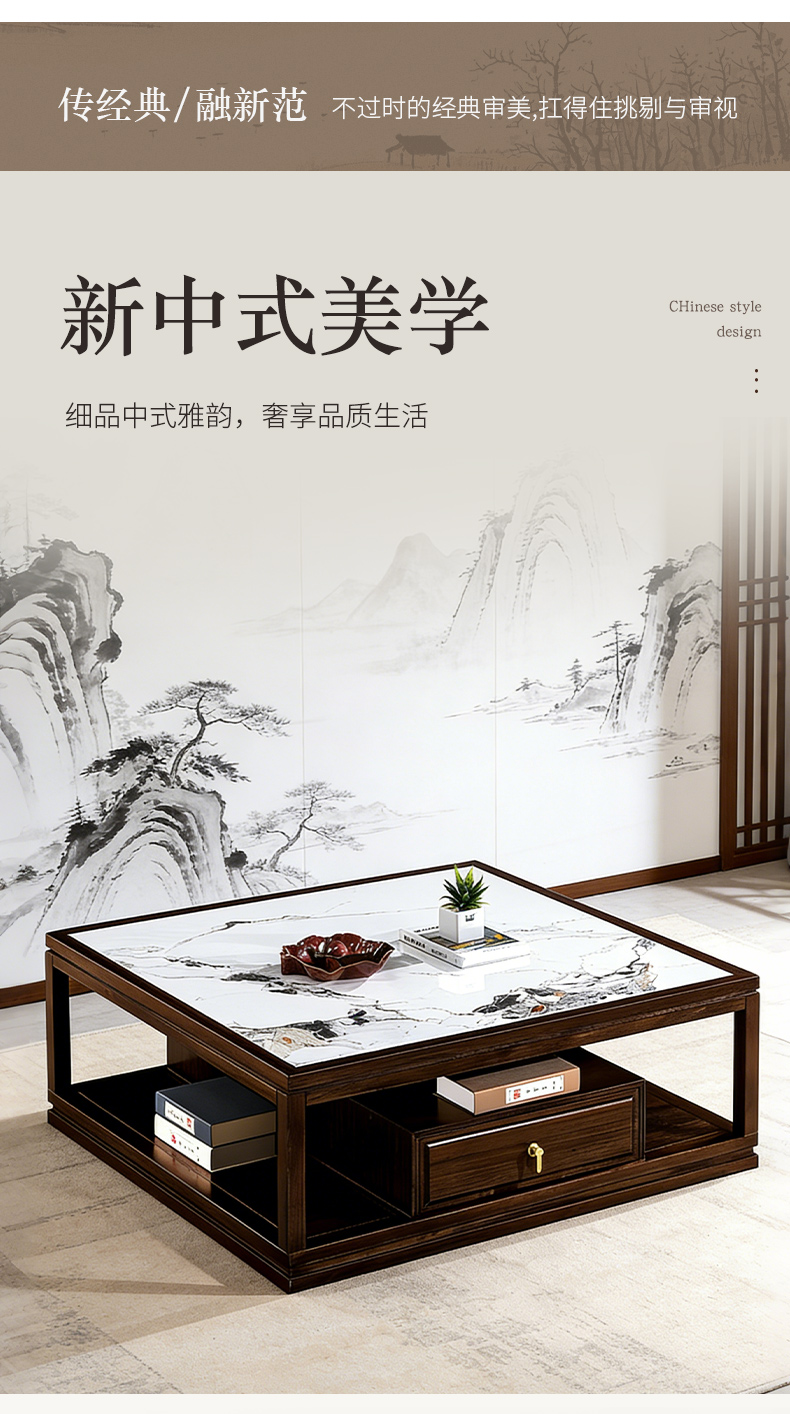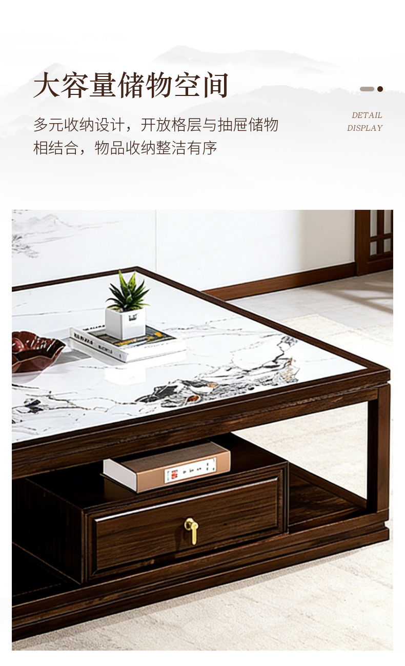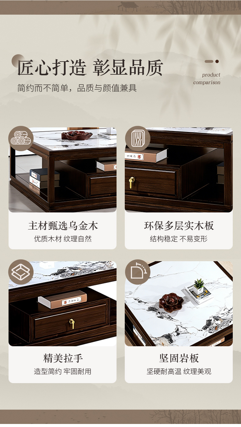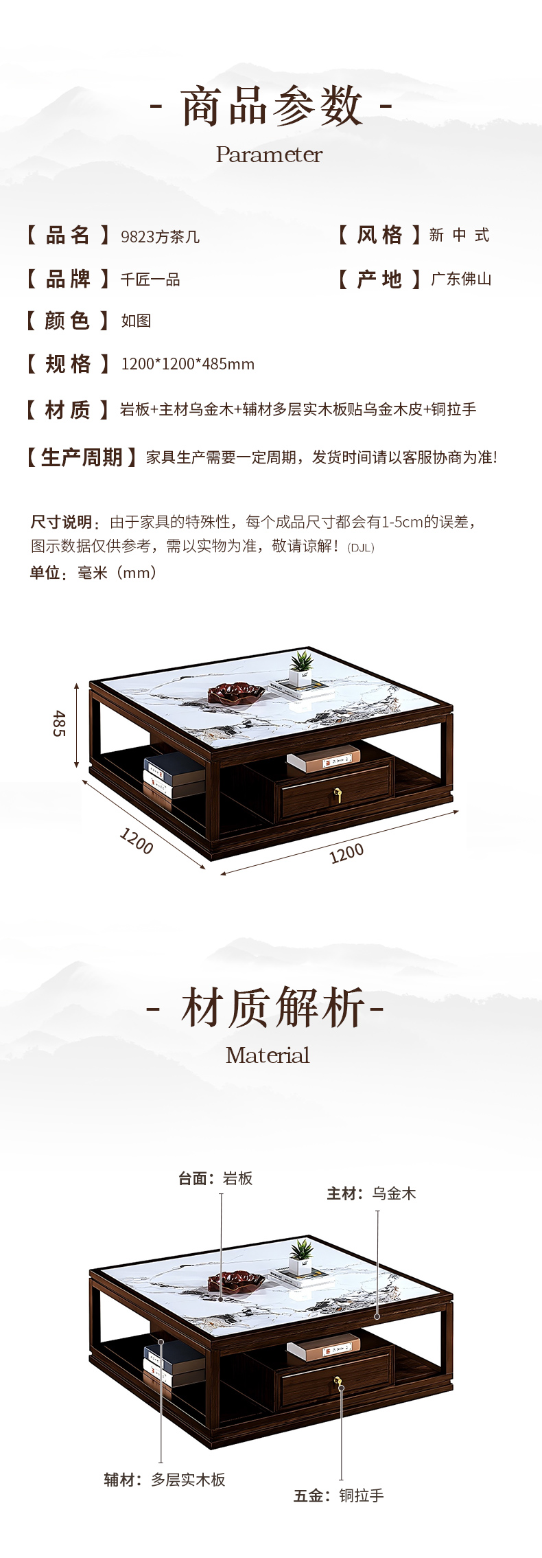 商品名称:千匠一品 新中式风格 岩板+主材乌金木+辅材多层实木板贴乌金木皮+铜拉手 时尚优雅方茶几9823-J