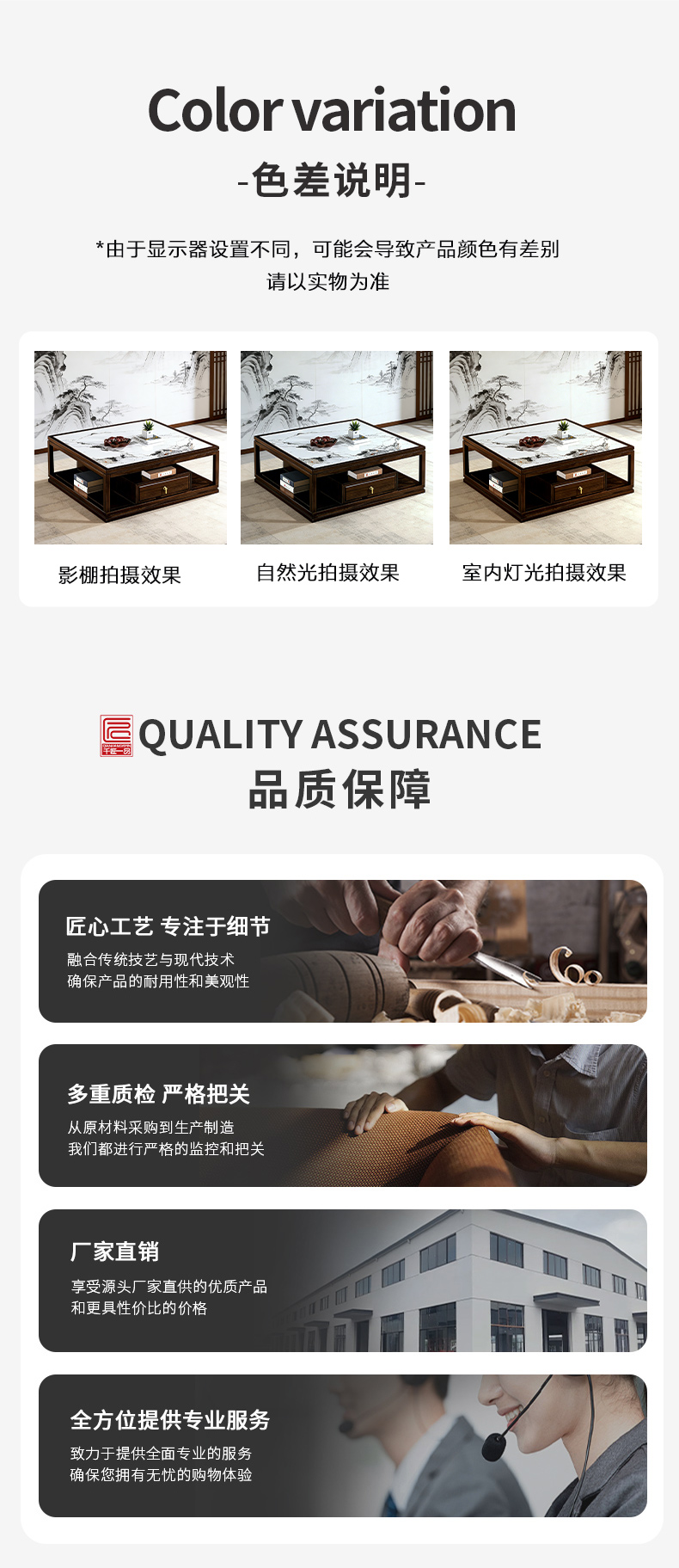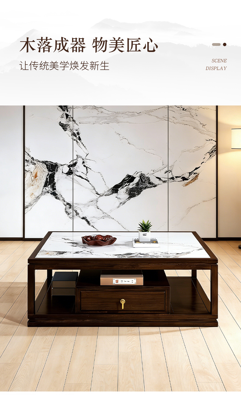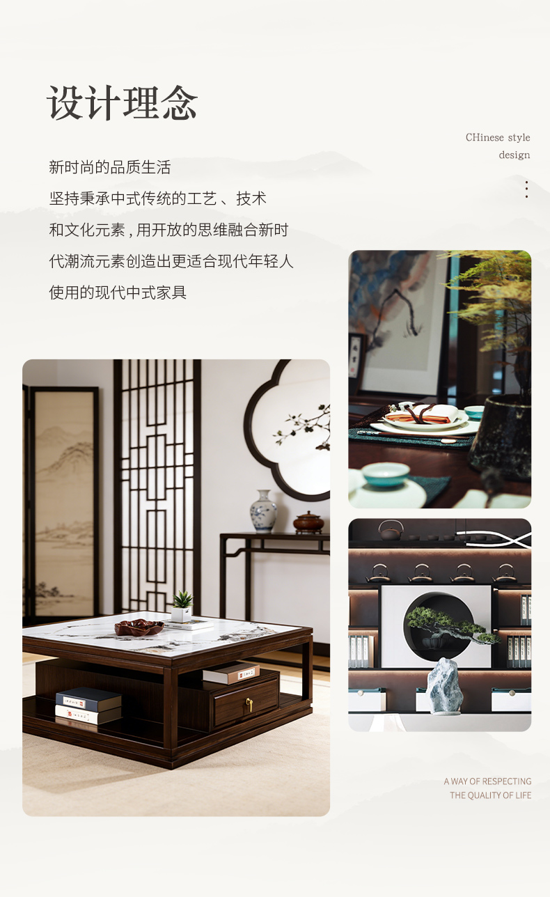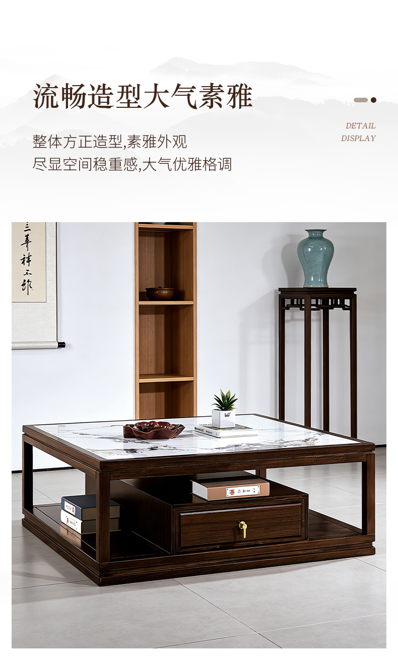 商品名称:千匠一品 新中式风格 岩板+主材乌金木+辅材多层实木板贴乌金木皮+铜拉手 时尚优雅方茶几9823-J