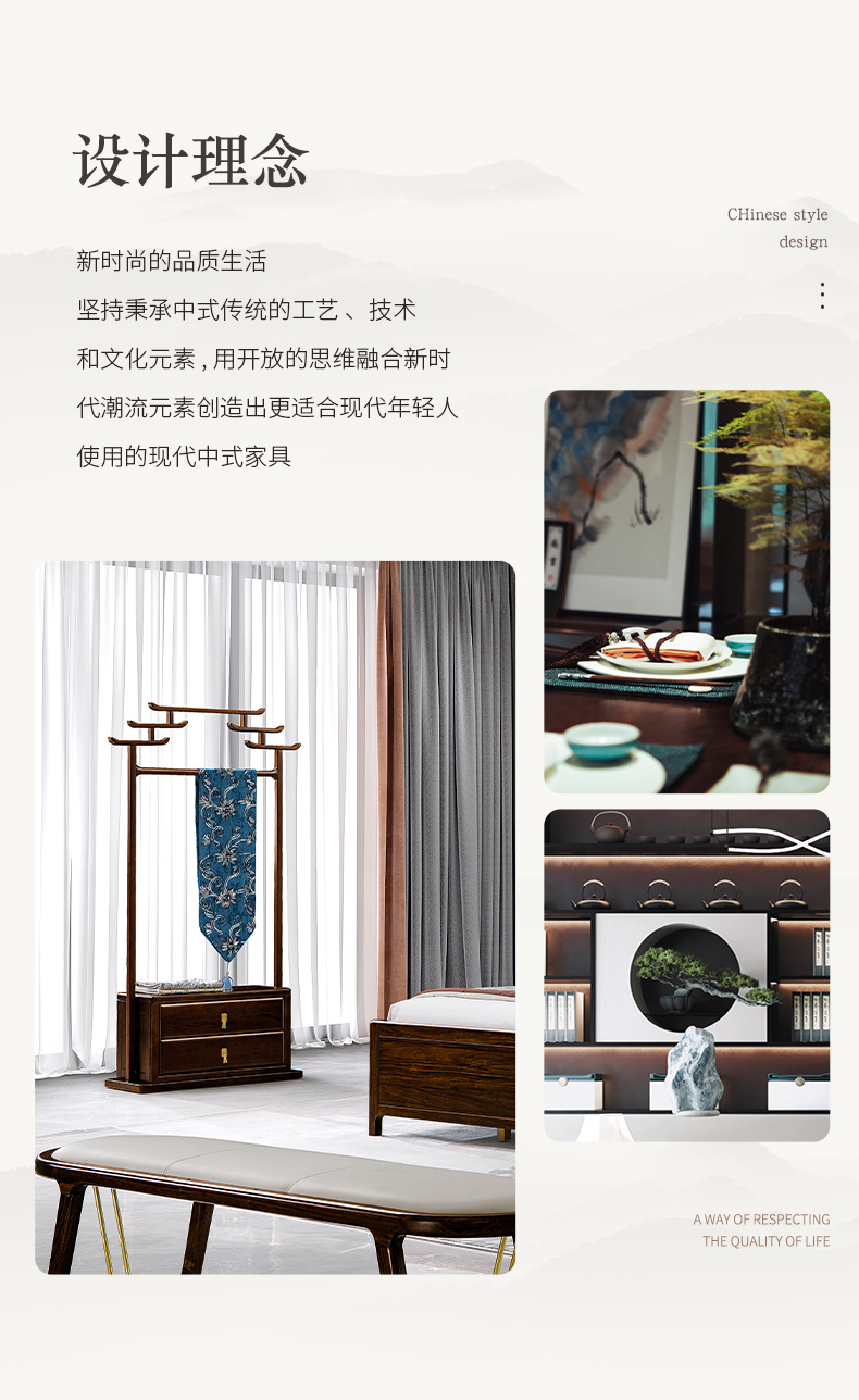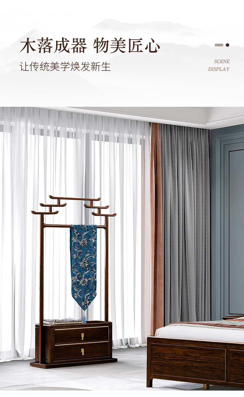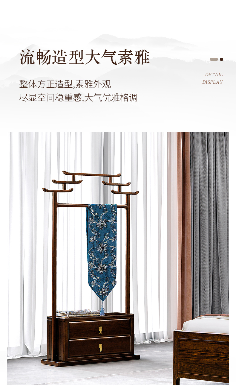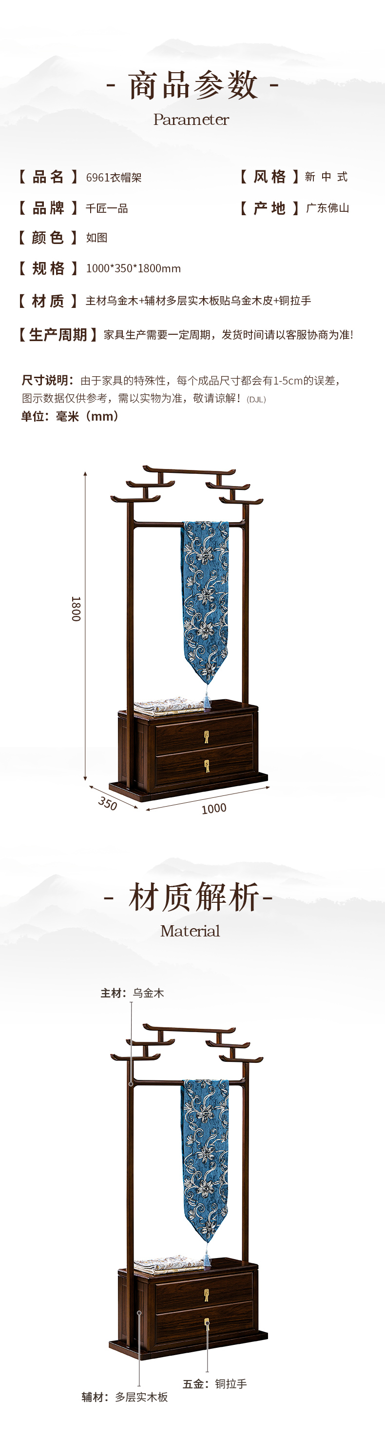 商品名称:千匠一品 新中式风格 主材乌金木+辅材多层实木板贴乌金木皮+铜拉手 时尚优雅衣帽架6961-J