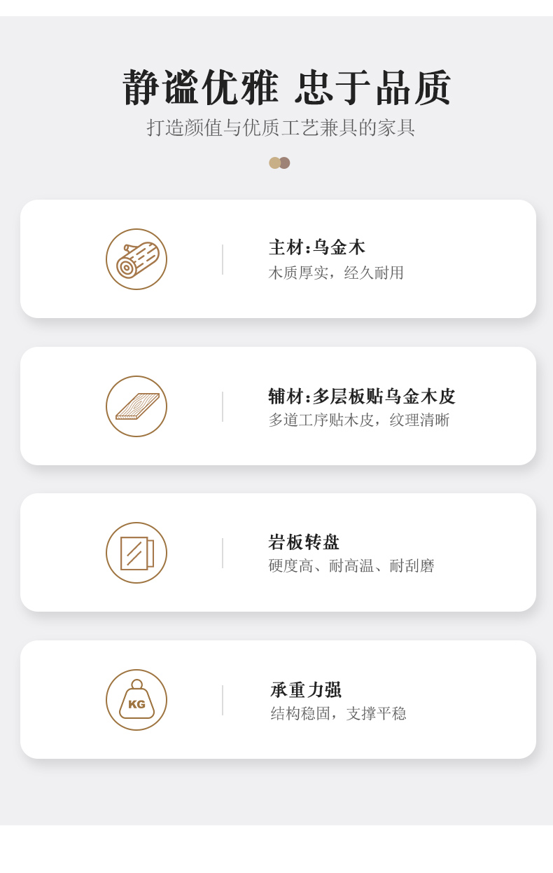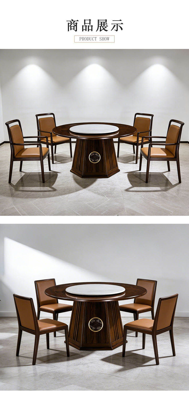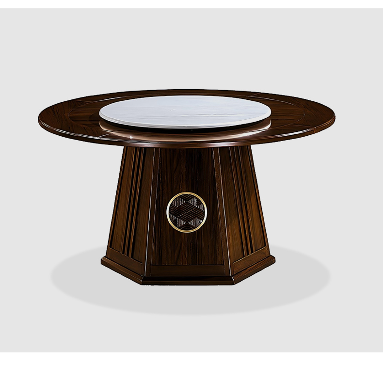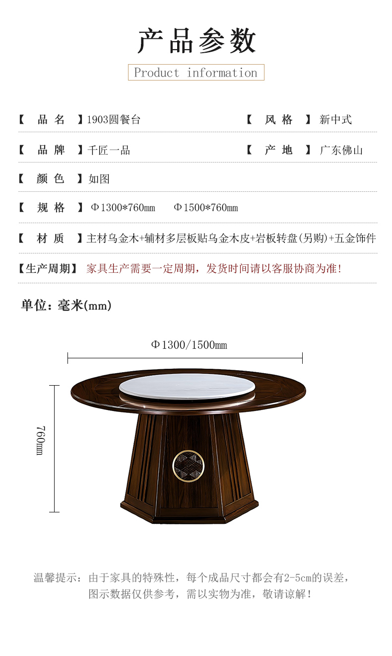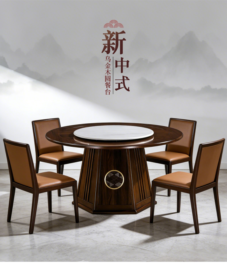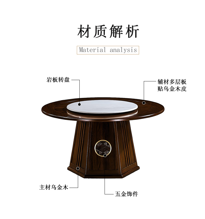 商品名称:千匠一品 新中式风格 主材乌金木+辅材多层板贴乌金木皮+另购岩板转盘+五金配件 时尚优雅餐桌1903-J