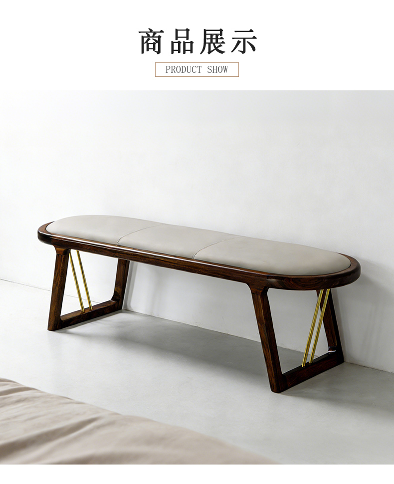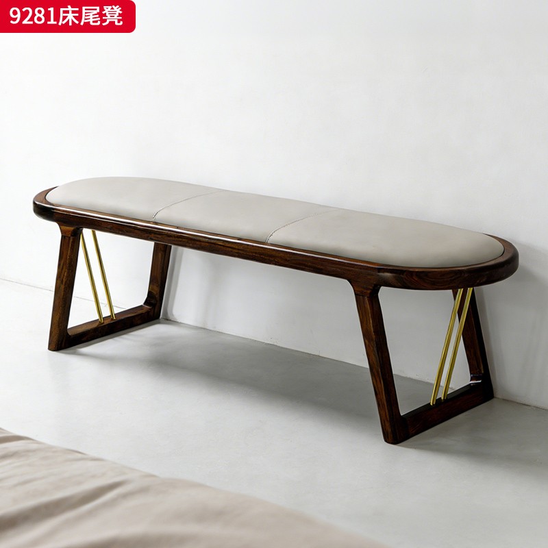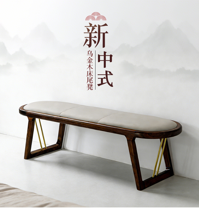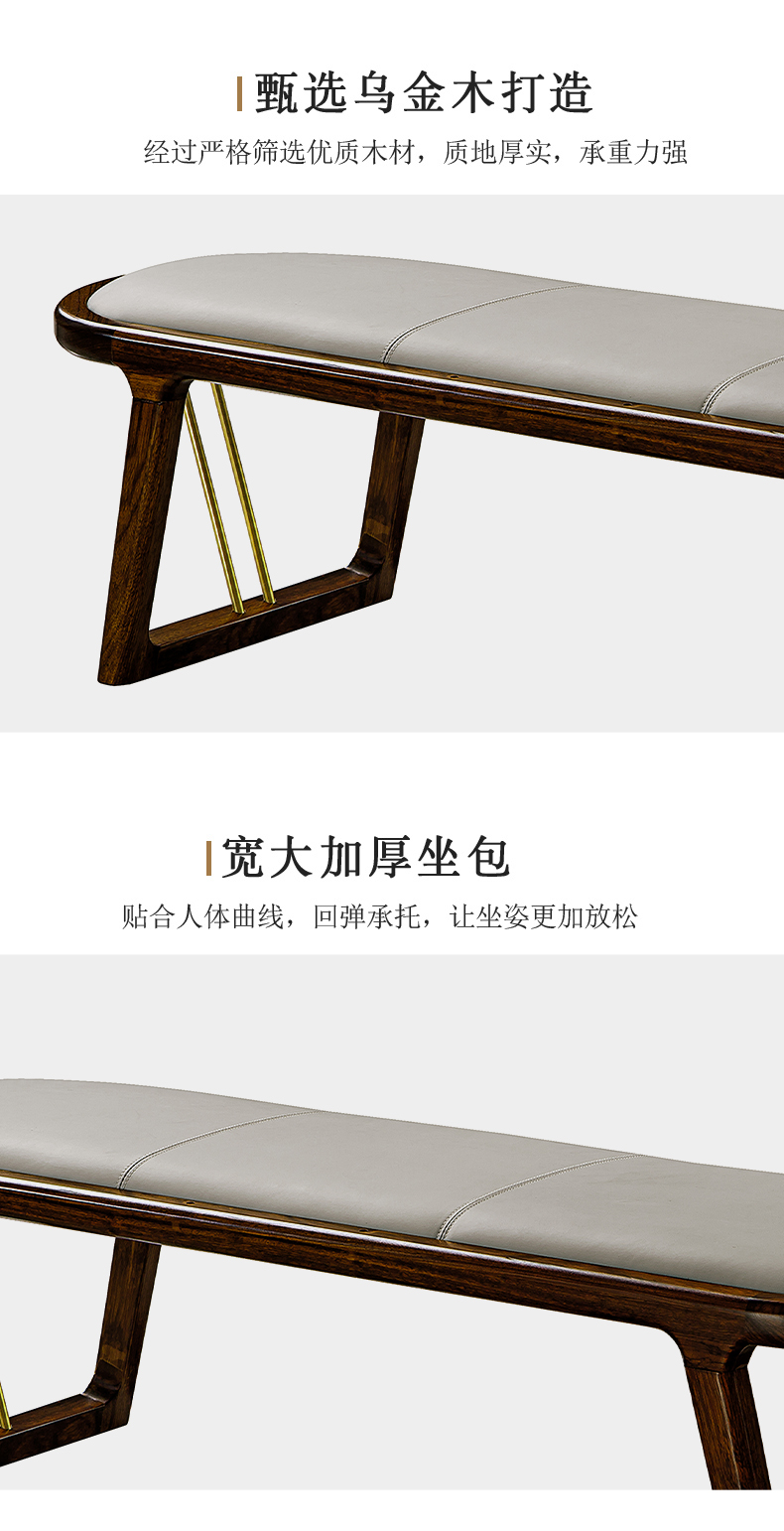 千匠一品 新中式风格 主材乌金木+辅材多层板贴乌金木皮+皮艺座包+五金饰条 时尚优雅床尾凳9281-J