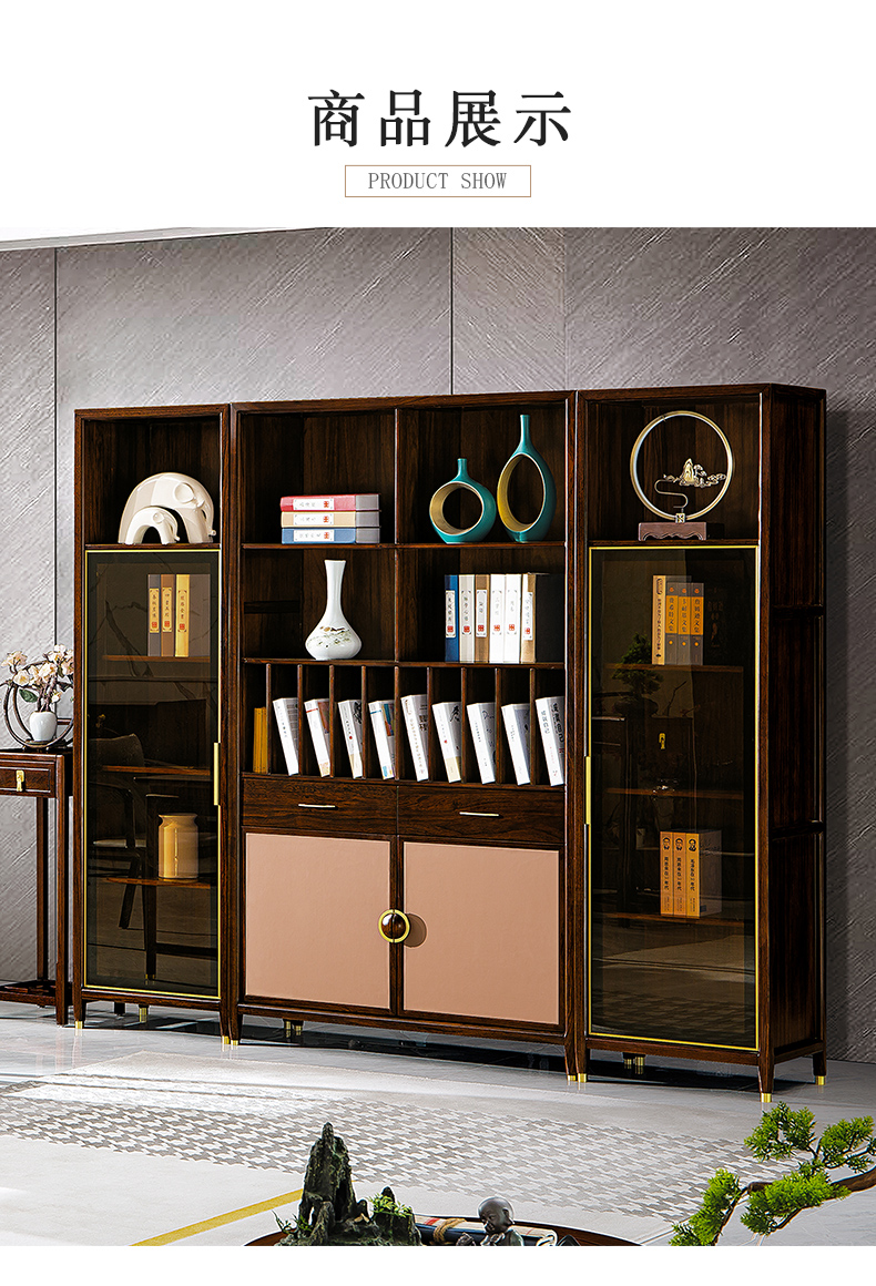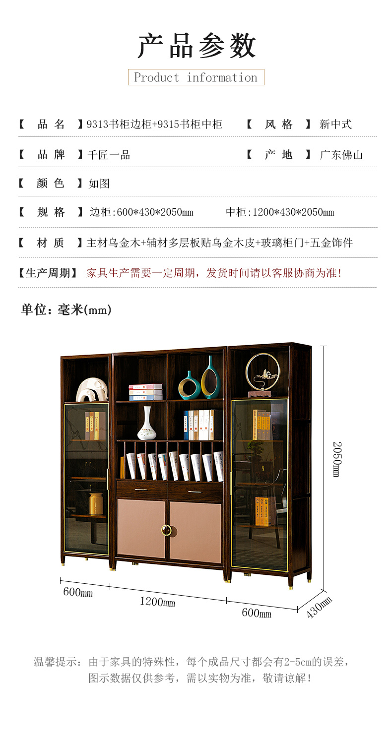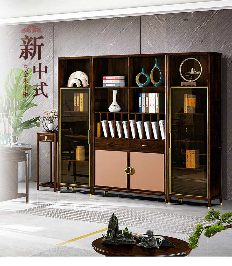 商品名称:千匠一品 新中式风格 主材乌金木+辅材多层板贴乌金木皮+玻璃柜门+五金饰件 时尚优雅书柜边柜9313 书柜中柜9315-J