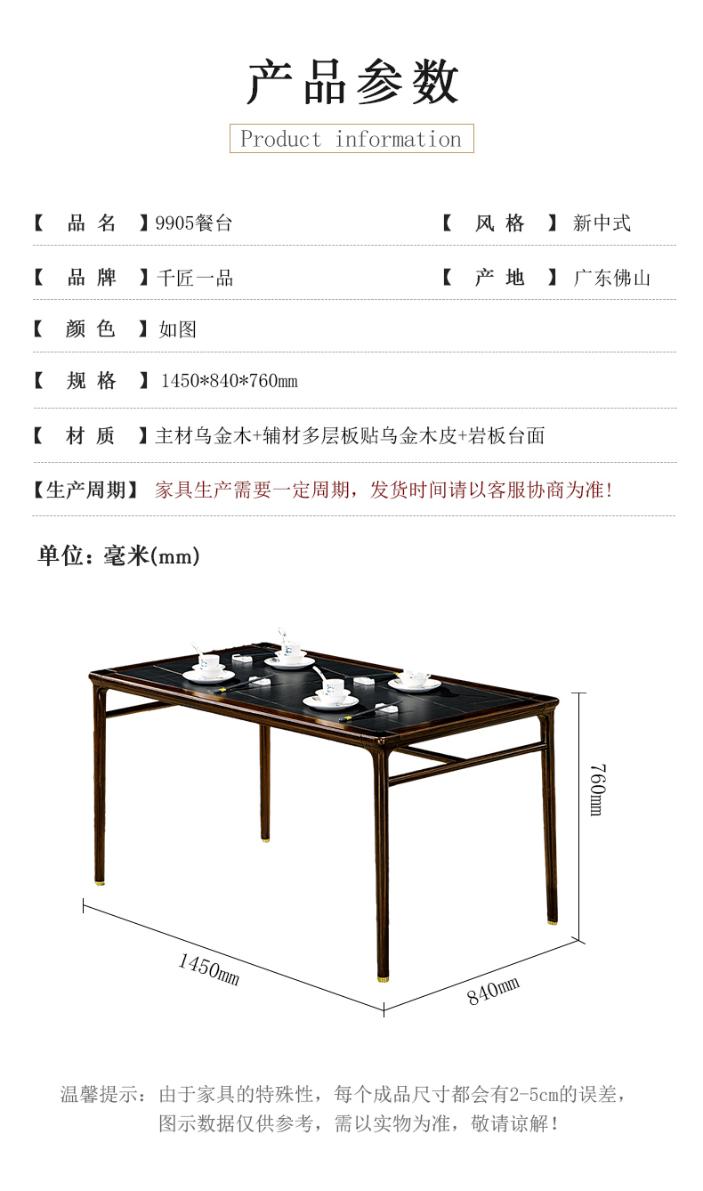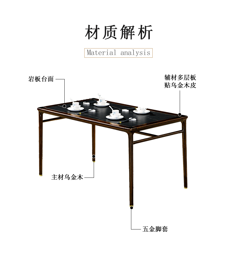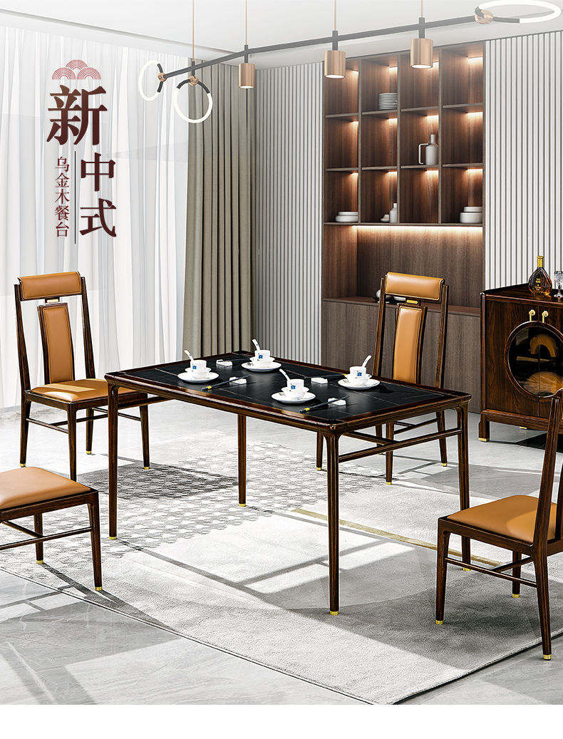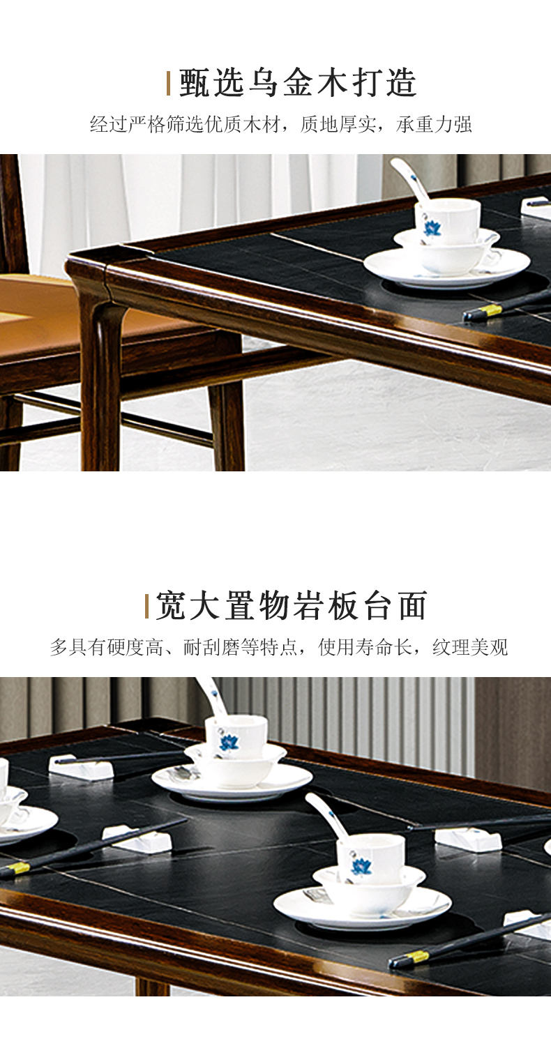 商品名称:千匠一品 新中式风格 主材乌金木+辅材多层板贴乌金木皮+岩板台面 时尚大气餐台9905-J