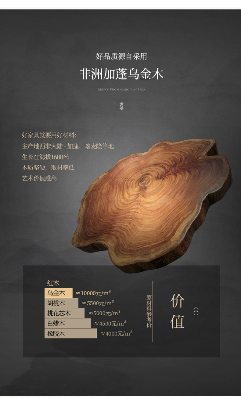 千匠一品 新中式风格 主材乌金木+辅材多层实木板贴乌金木皮+另购大理石桌面 时尚优雅石木两用餐台6820-J