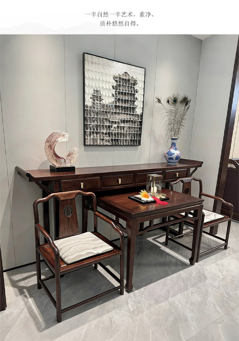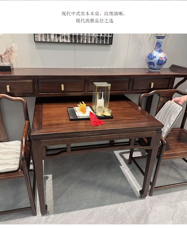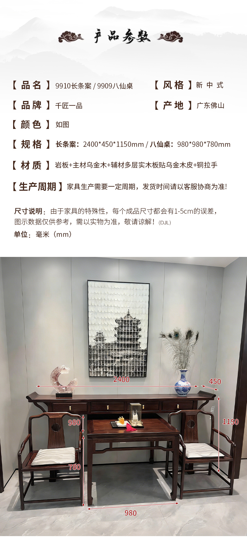 商品名称:千匠一品 新中式风格 岩板+主材乌金木+辅材多层实木板贴乌金木皮+铜拉手 时尚优雅长条案9910 八仙桌9909-J