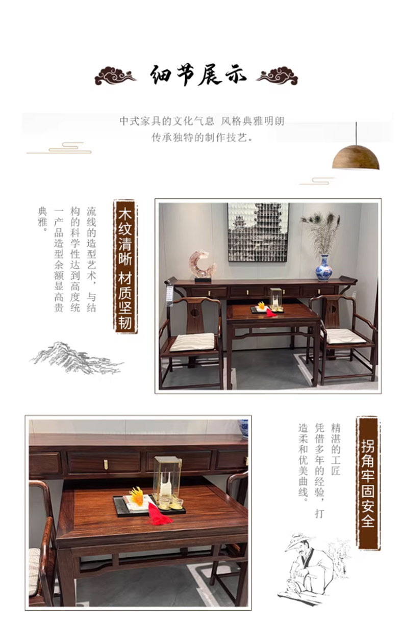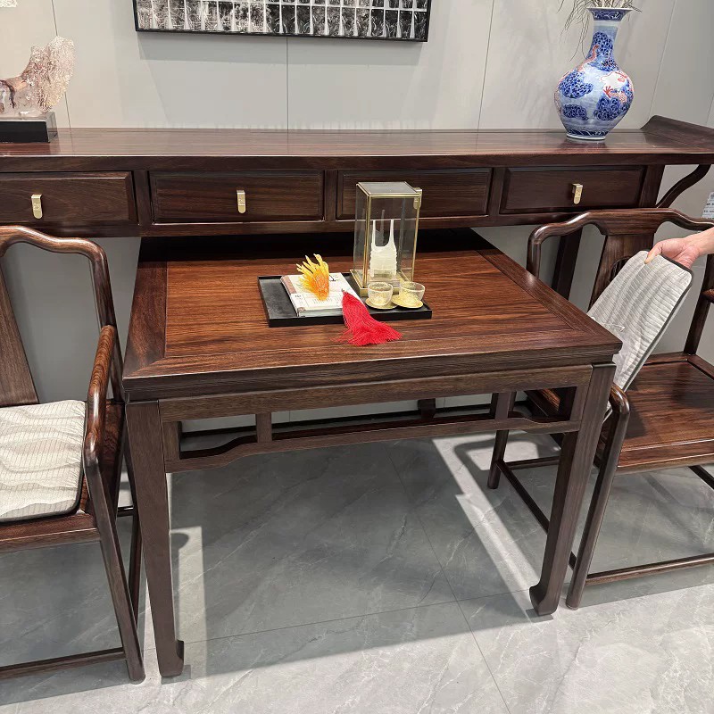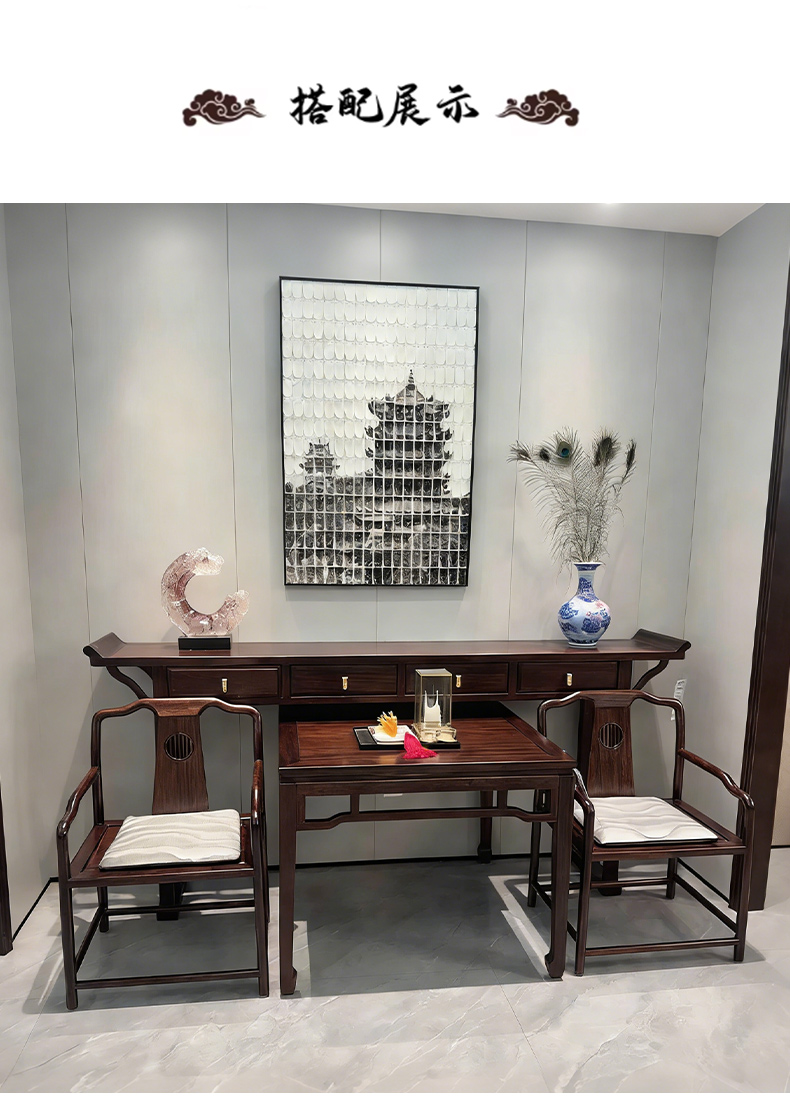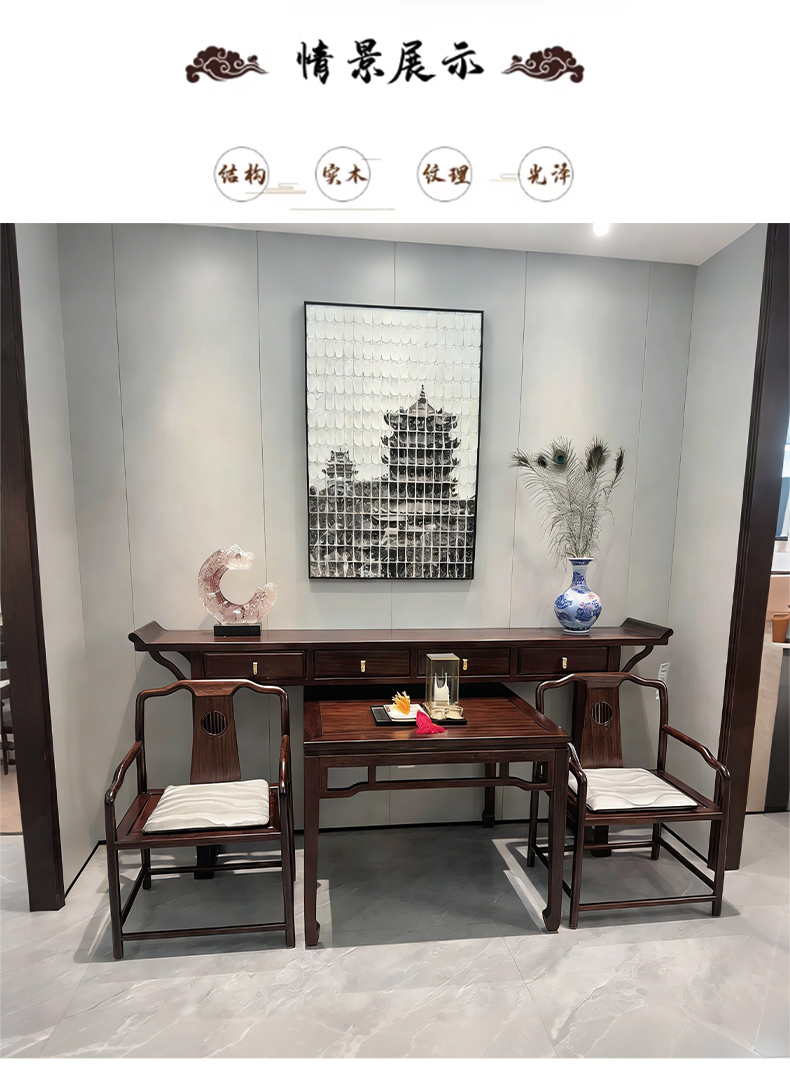 商品名称:千匠一品 新中式风格 岩板+主材乌金木+辅材多层实木板贴乌金木皮+铜拉手 时尚优雅长条案9910 八仙桌9909-J
