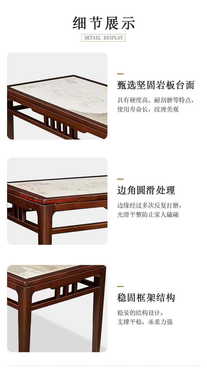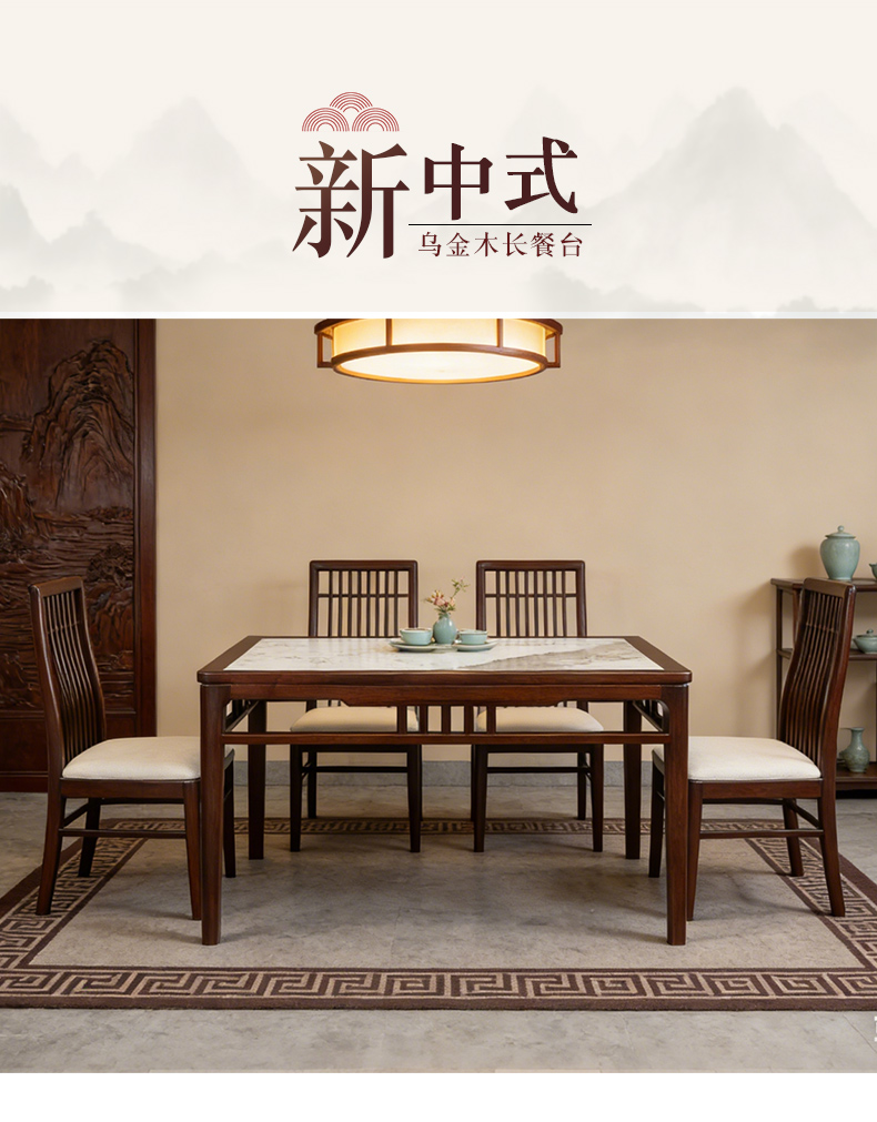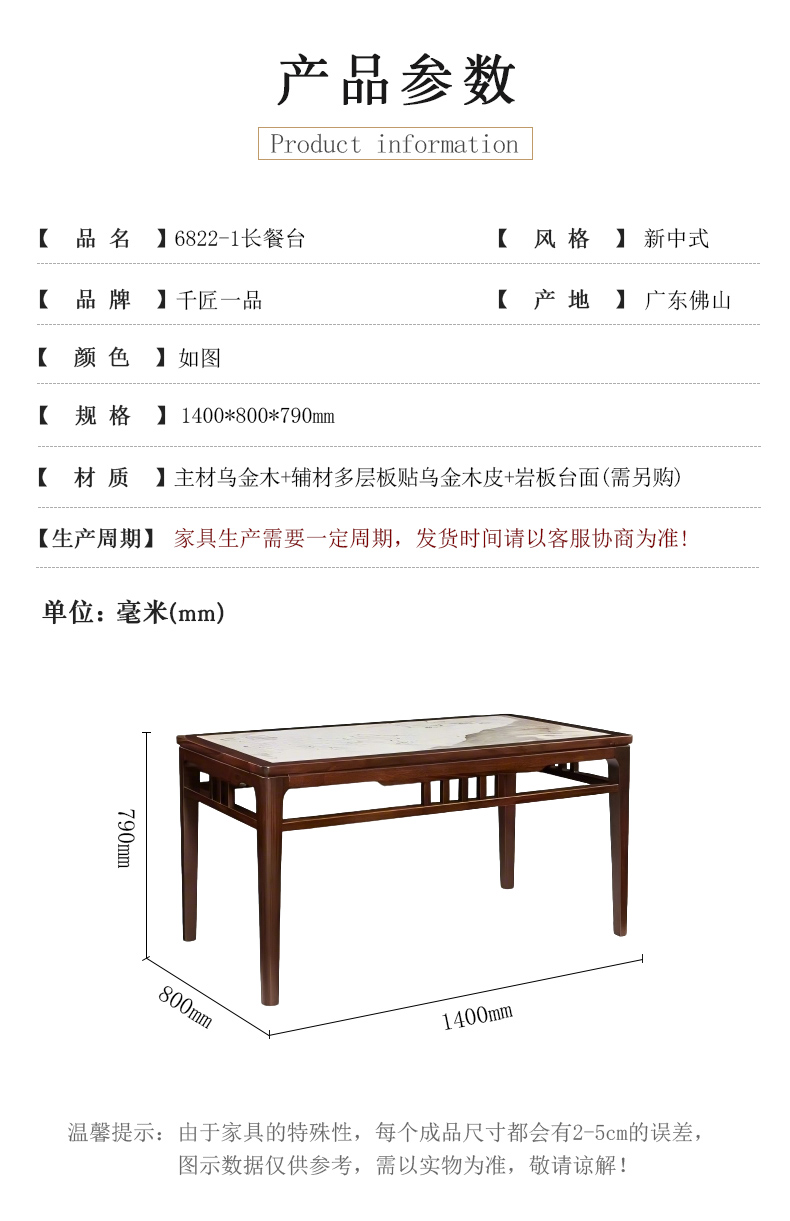 商品名称:千匠一品 新中式风格 主材乌金木+辅材多层实木板贴乌金木皮+另购岩板台面 时尚大气长餐台6822-1-J