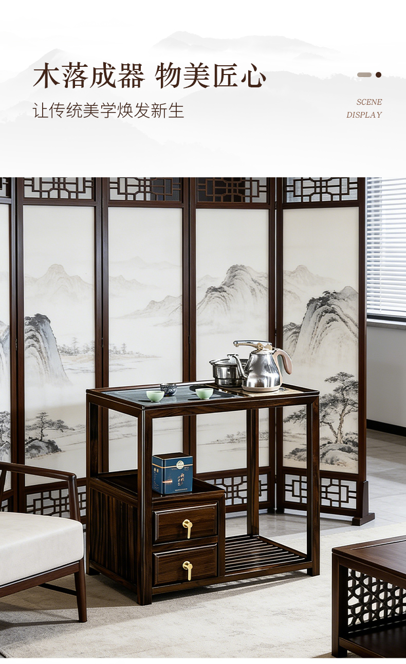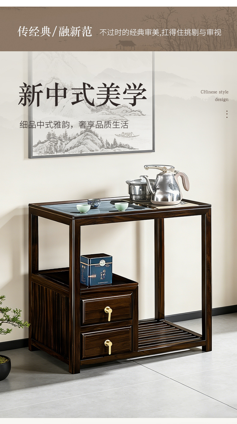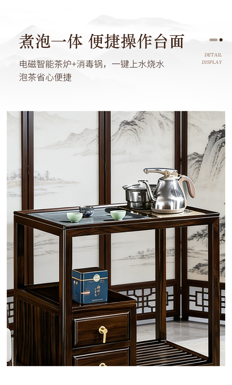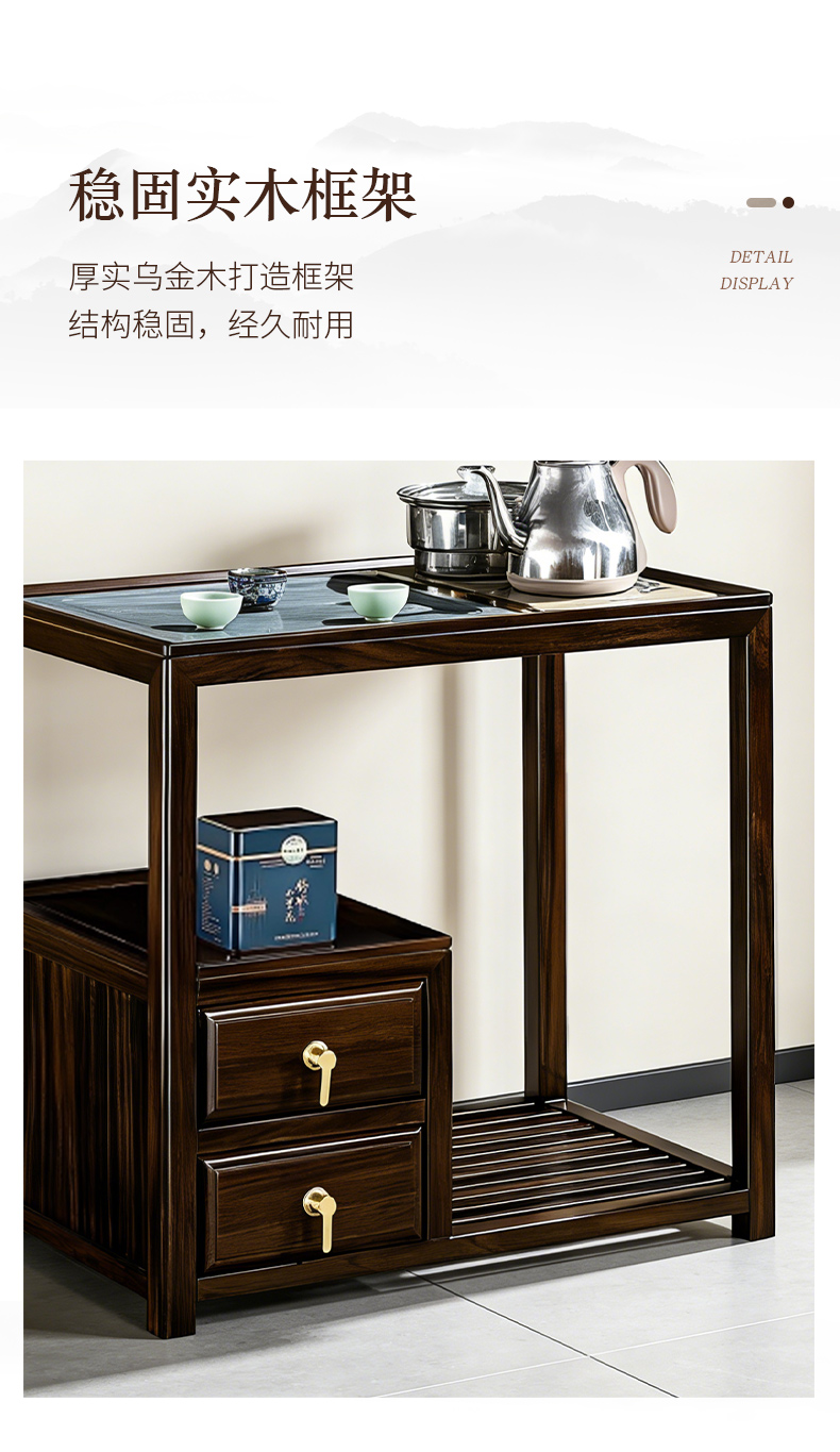 千匠一品 新中式风格 主材乌金木+辅材多层实木板贴乌金木皮+铜拉手+智能茶炉 时尚优雅茶水柜9612-J