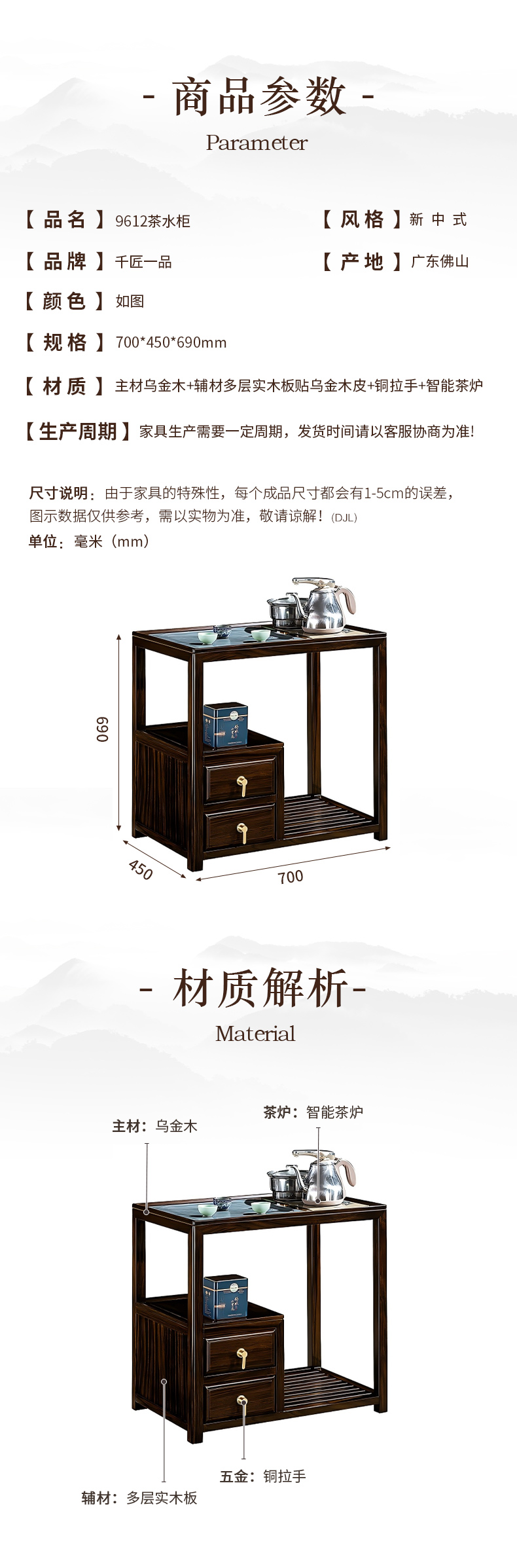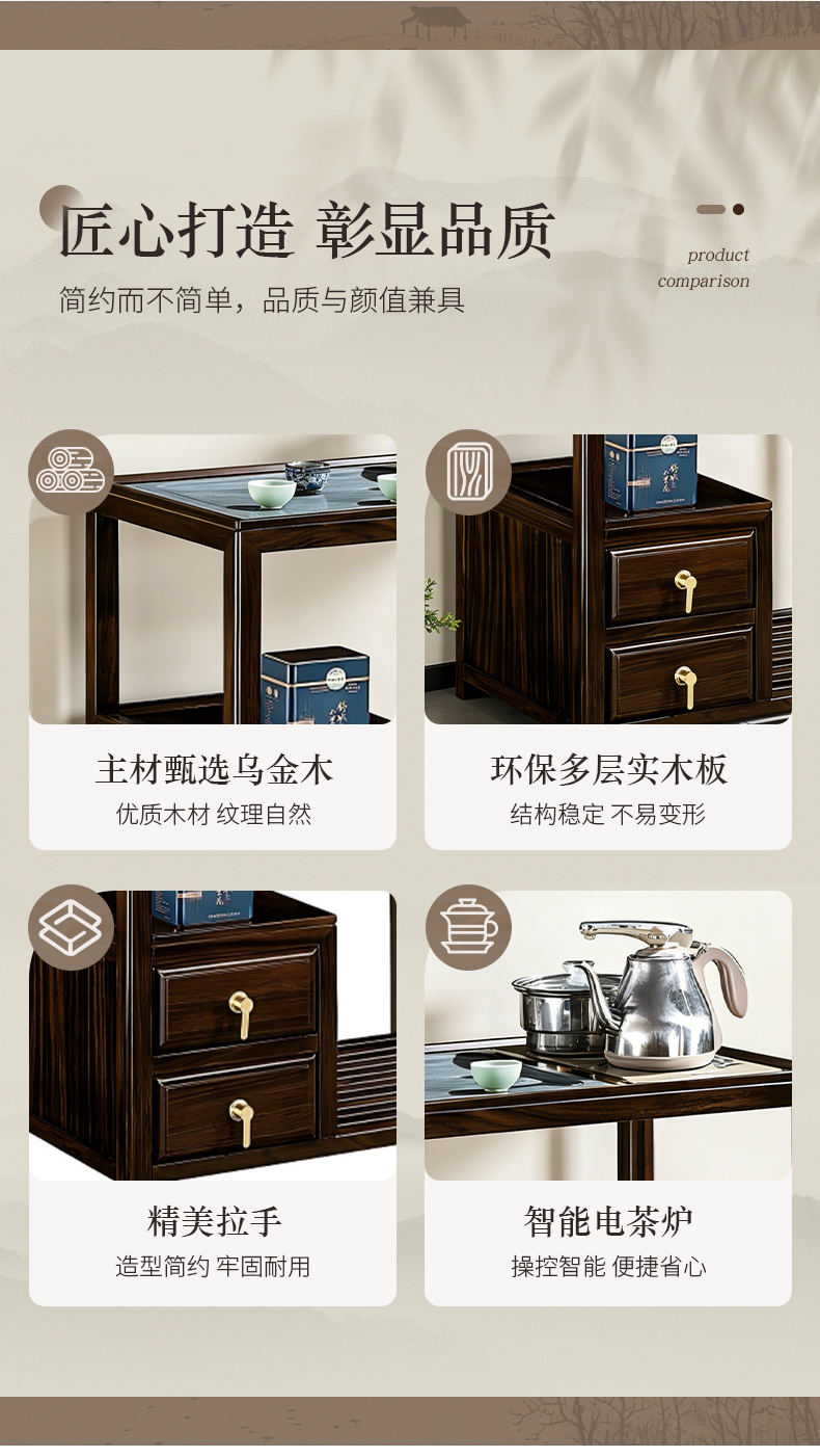 商品名称:千匠一品 新中式风格 主材乌金木+辅材多层实木板贴乌金木皮+铜拉手+智能茶炉 时尚优雅茶水柜9612-J
