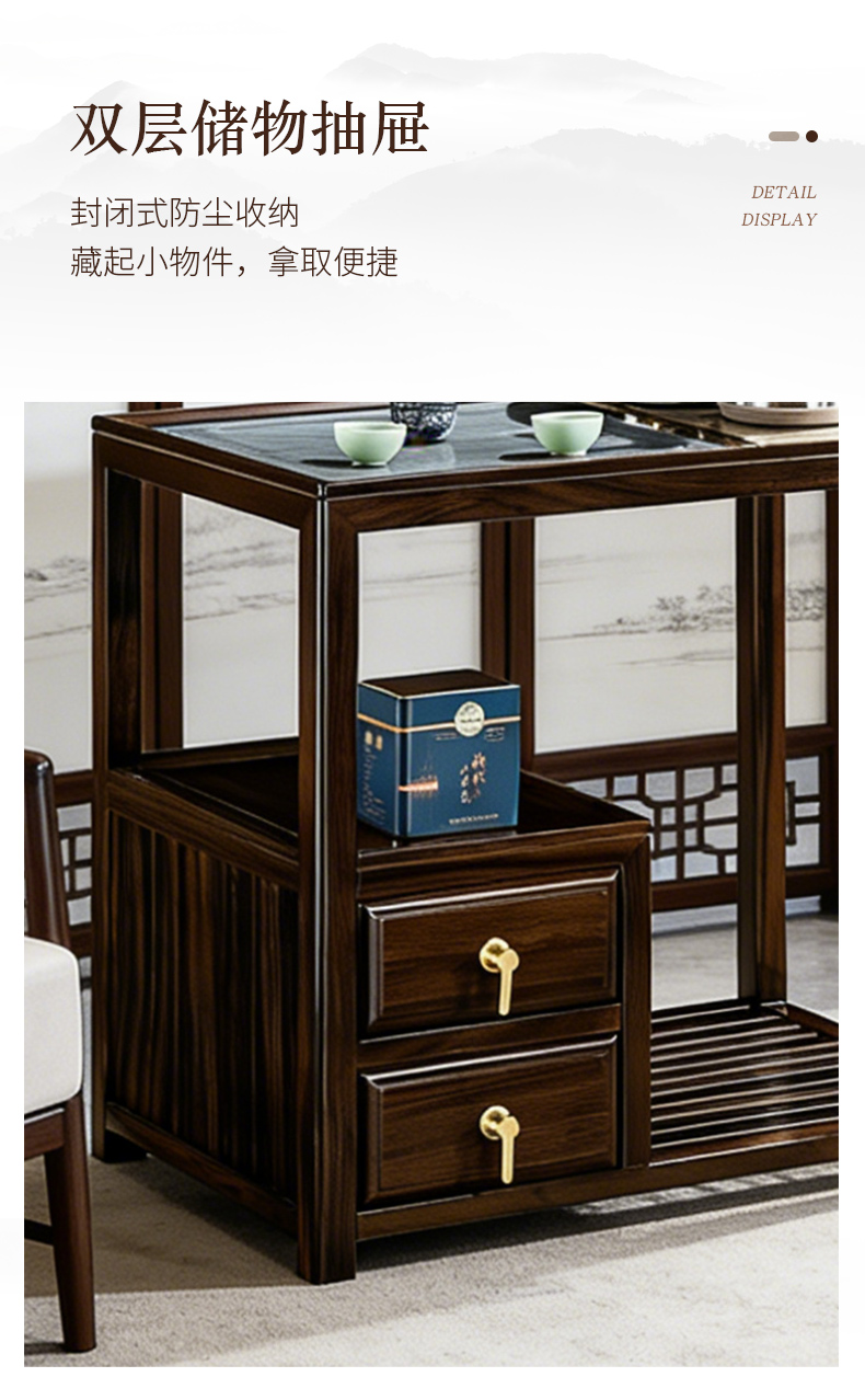千匠一品 新中式风格 主材乌金木+辅材多层实木板贴乌金木皮+火烧石 时尚优雅茶台9601-J