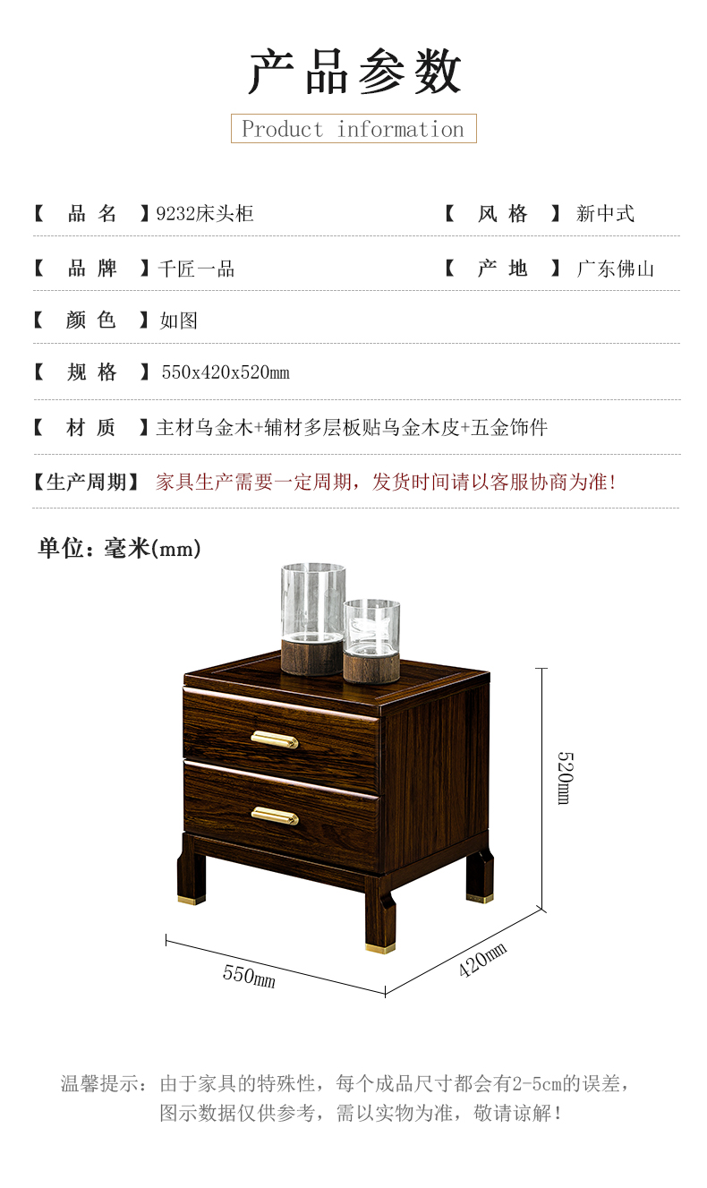 商品名称:千匠一品 新中式风格 主材乌金木+辅材多层板贴乌金木皮+五金饰件 时尚大气床头柜9232-L